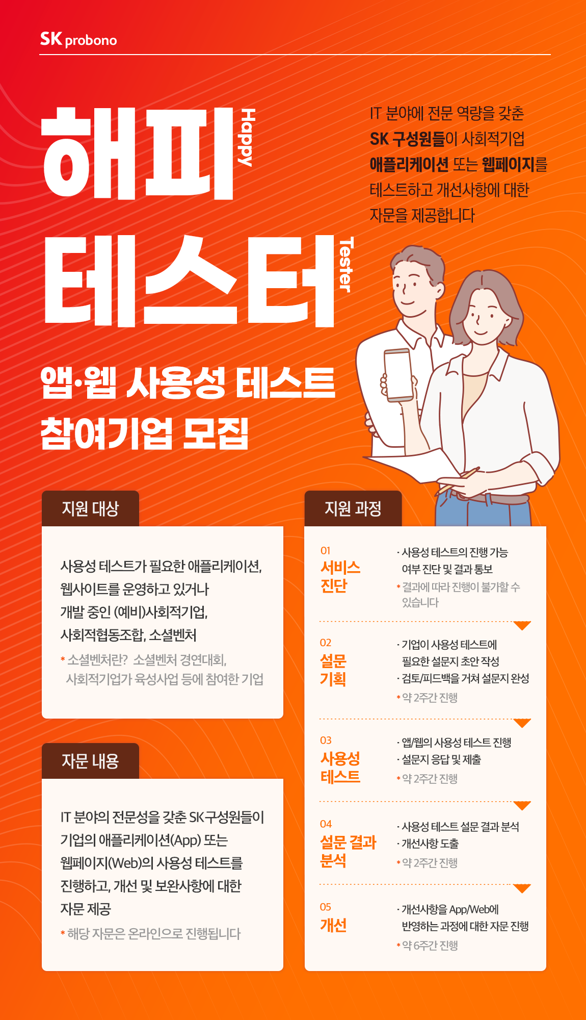 사회 문제 해결을 위해 앱/웹 서비스를 운영 중인 사회적 기업의 앱/웹 서비스 개선을 SK프로보노가 도와드립니다.