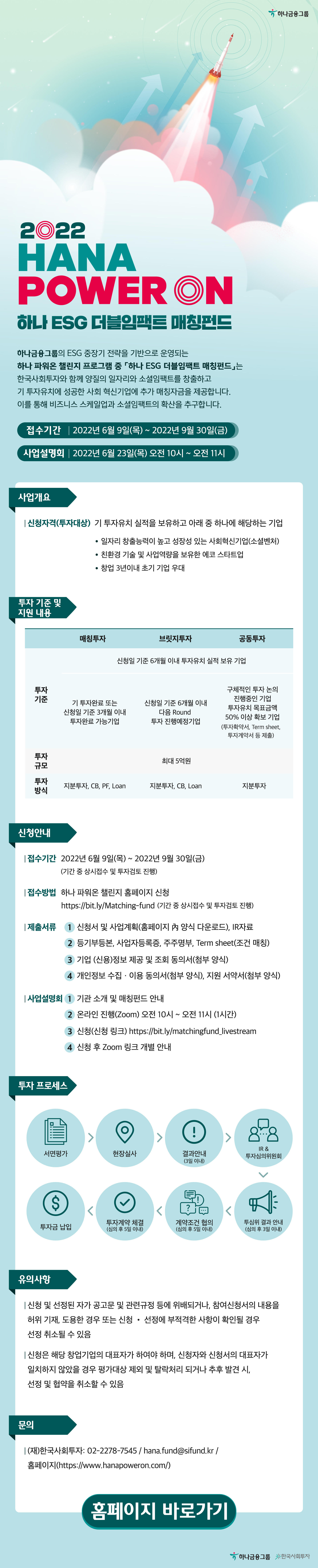 『하나 ESG 더블임팩트 매칭펀드』에 지원할 투자기업을 모집하오니 기관 내 투자 포트폴리오 중 신청자격에 해당되는 사회혁신기업에 많은 추천 부탁드립니다.