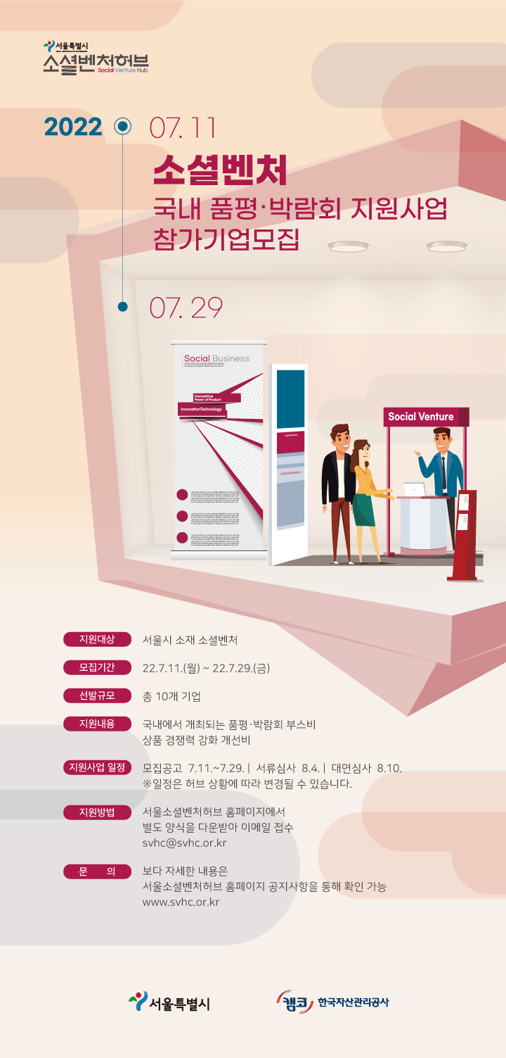서울특별시가 운영하는 서울소셜벤처허브에서 제품 홍보 및 판로 확대를 위해 국내 품평 박람회 참가를 지원합니다.