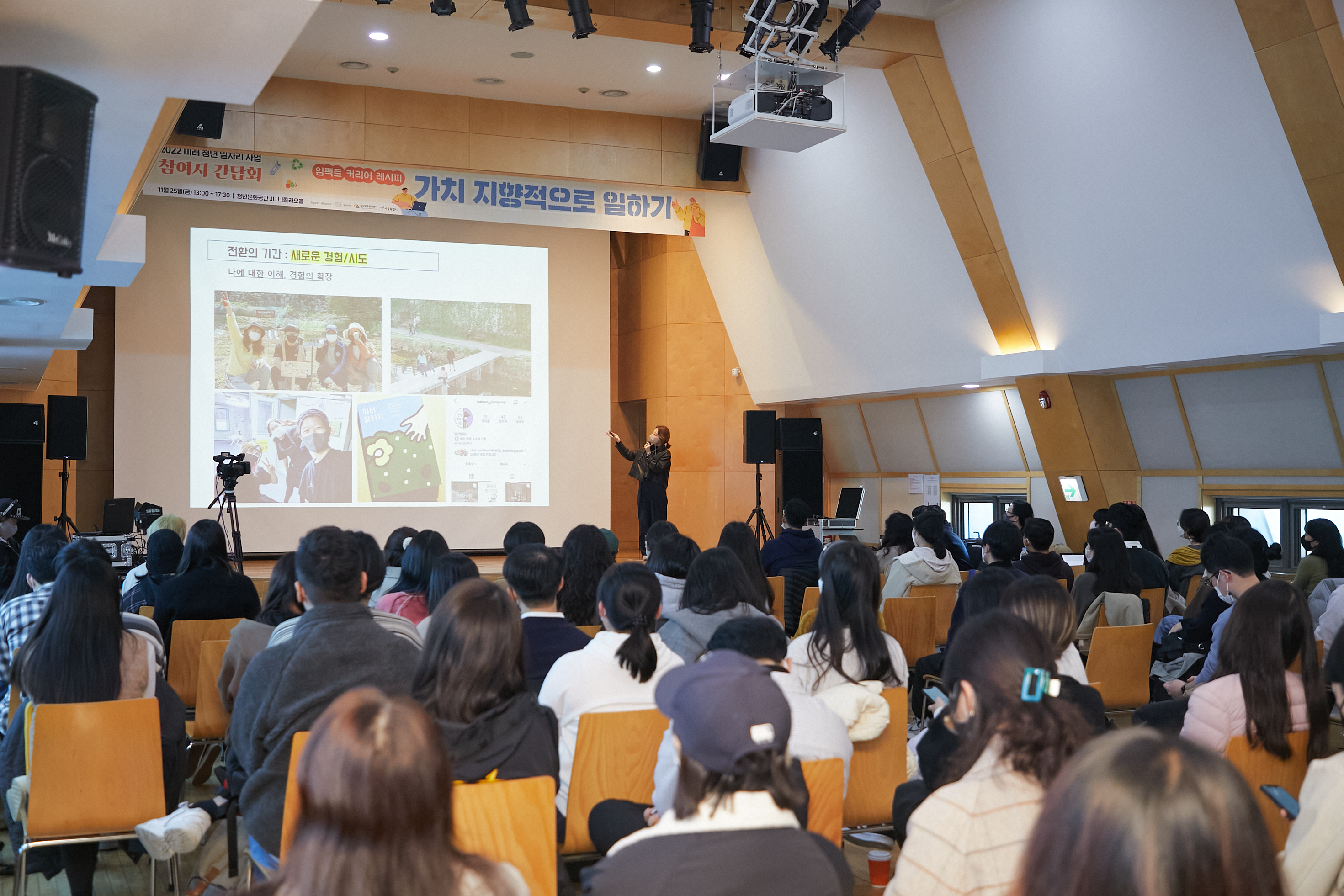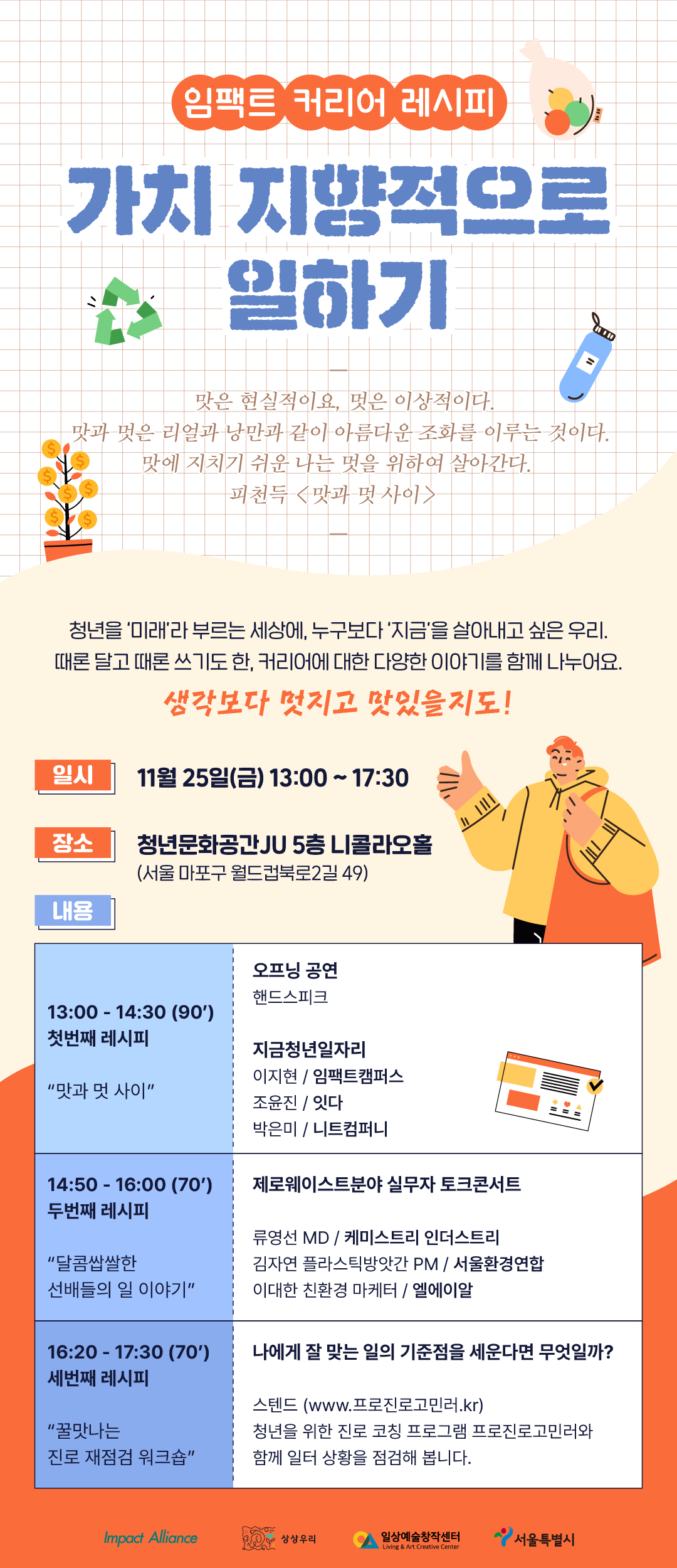 지난 2022년 11월 25일, 서울 마포구 청년문화공간 JU에서 ‘임팩트 커리어 레시피 : 가치지향적으로 일하기’가 진행됐다. ‘가치를 지향하는 일’의 시작과 과정에 대한 이야기를 다루고 일을 더 잘하기 위한 이야기를 나눴다. 이번 자리는 임팩트얼라이언스와 일상예술창작센터, 상상우리가 함께 마련했으며 서울시 미래청년일자리사업에 참여하는 청년들을 대상으로 진행됐다.