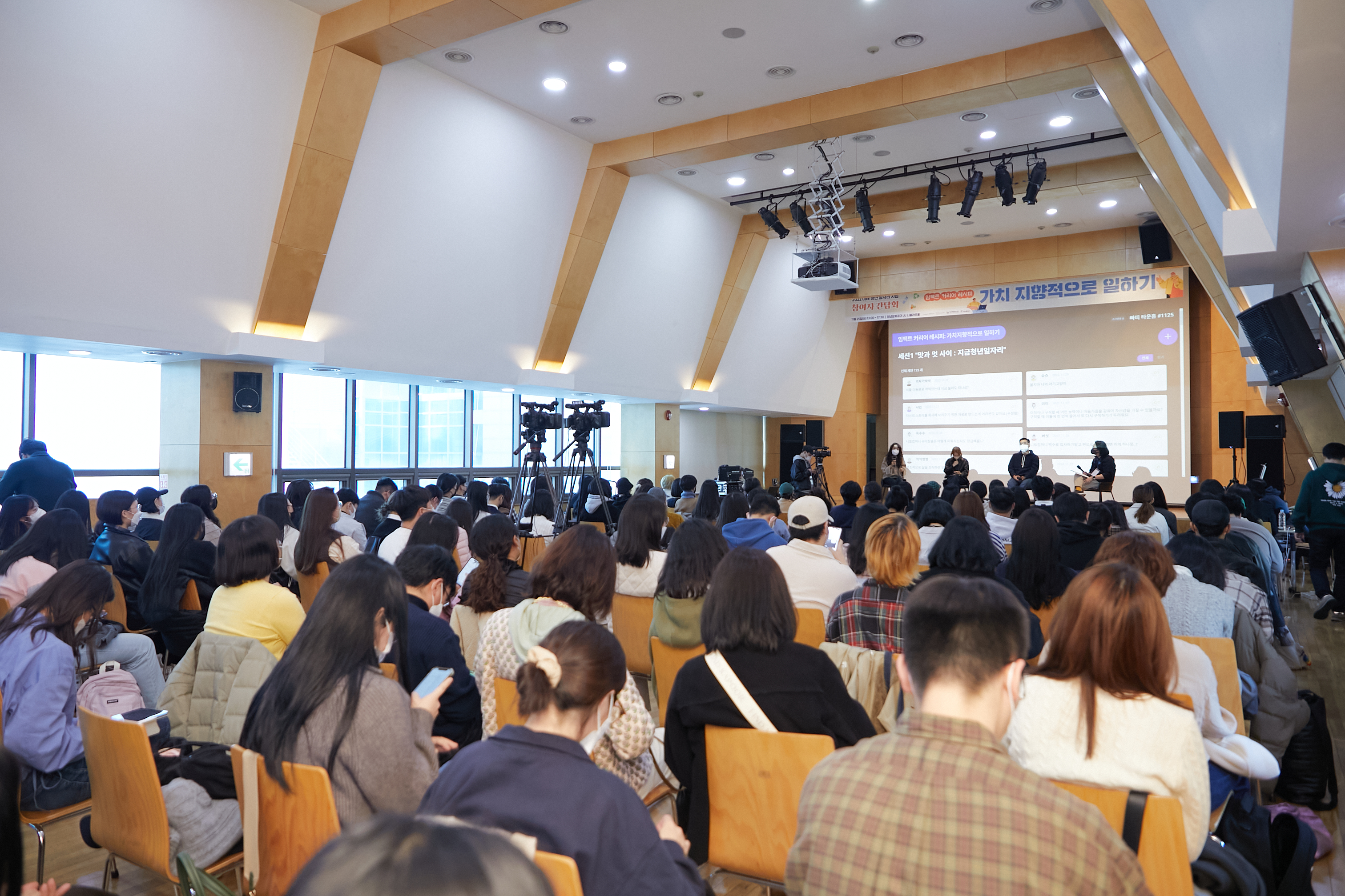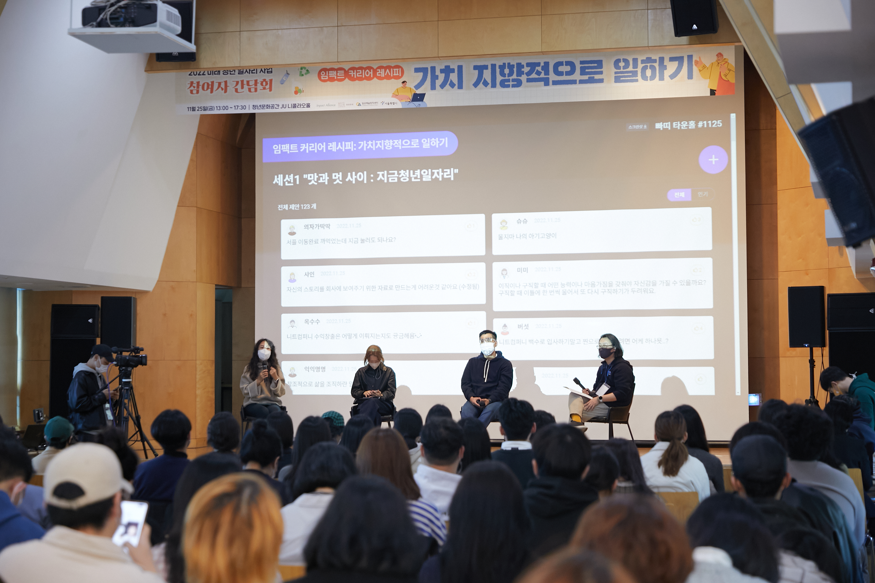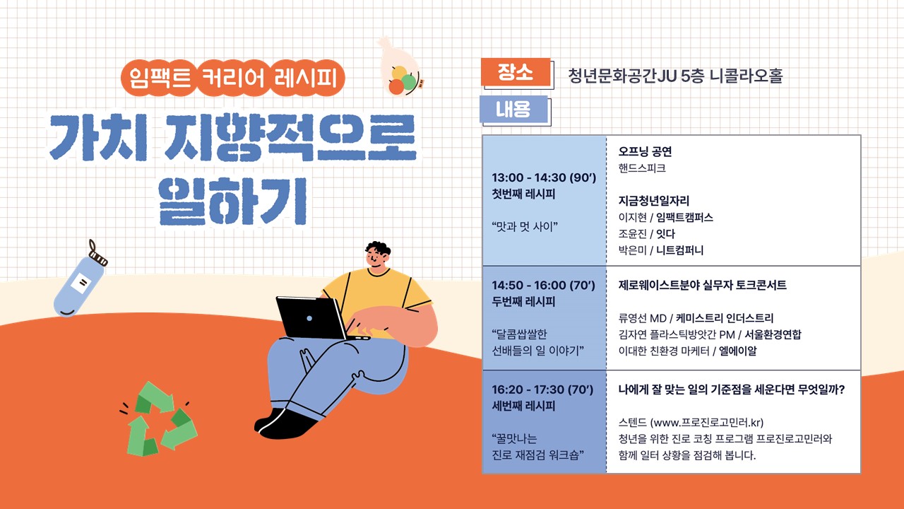 지난 2022년 11월 25일, 서울 마포구 청년문화공간 JU에서 ‘임팩트 커리어 레시피 : 가치지향적으로 일하기’가 진행됐다. ‘가치를 지향하는 일’의 시작과 과정에 대한 이야기를 다루고 일을 더 잘하기 위한 이야기를 나눴다. 이번 자리는 임팩트얼라이언스와 일상예술창작센터, 상상우리가 함께 마련했으며 서울시 미래청년일자리사업에 참여하는 청년들을 대상으로 진행됐다.