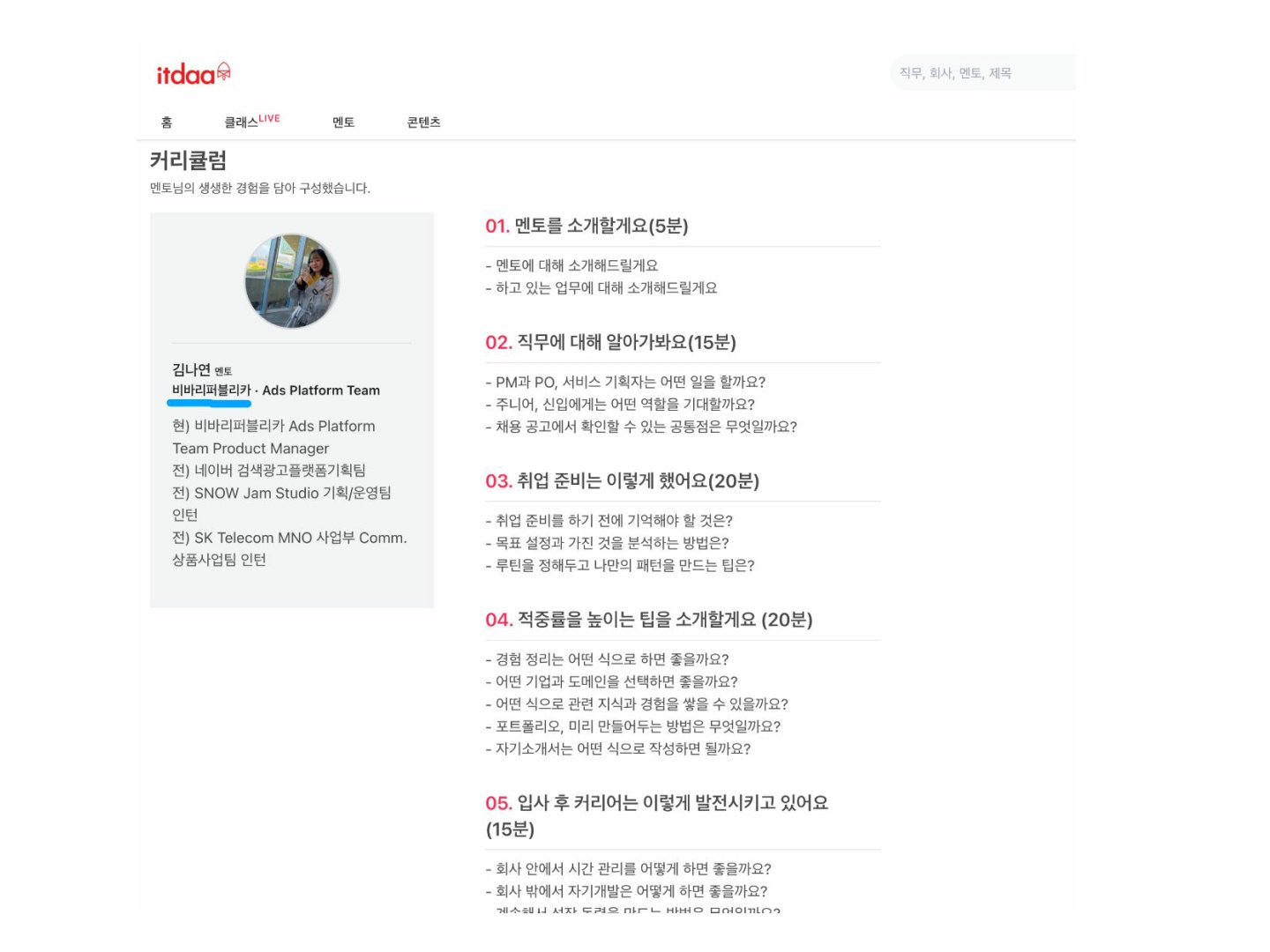 취업을 준비하는 취업준비생이나 사회초년생들 중 ‘콘텐츠 마케팅’과 ‘프로덕트 마케팅’의 차이를 단번에 이해할 수 있는 사람은 많지 않다. 어떤 역량을 갖춰야하는지 어떤 업무를 하게 되는지 정확한 파악이 어렵다. 취업 준비를 하는 사람의 사회경제적 상황에 따라 이 정보격차는 더 벌어지게 되는 것이 현실이다. 잇다는 이런 취업정보격차 해결을 위해 직무의 역할과 차이를 현직자가 답해주는 온라인 멘토링 서비스다. 잇다는 연 150만 명이 이용중이다. 20여 국가의 영리를 포함한 비영리단체 등에 재직중인 1300여 명의 현직자들이 재직 중인 기업과 부서 등을 공개하며 멘토로 활동하고 있다. 조윤진 잇다 대표는 “직무와 산업은 계속 변화하고 있고 1,2년 내에 역량과 역할이 바뀌기도 해 현업에서 일하는 사람들을 만나는 것이 필요하다”며 “구글, 아마존, 애플, 삼성부터 국내외 비영리단체 재직자 등 다양한 풀을 갖추고 있다”고 말했다.