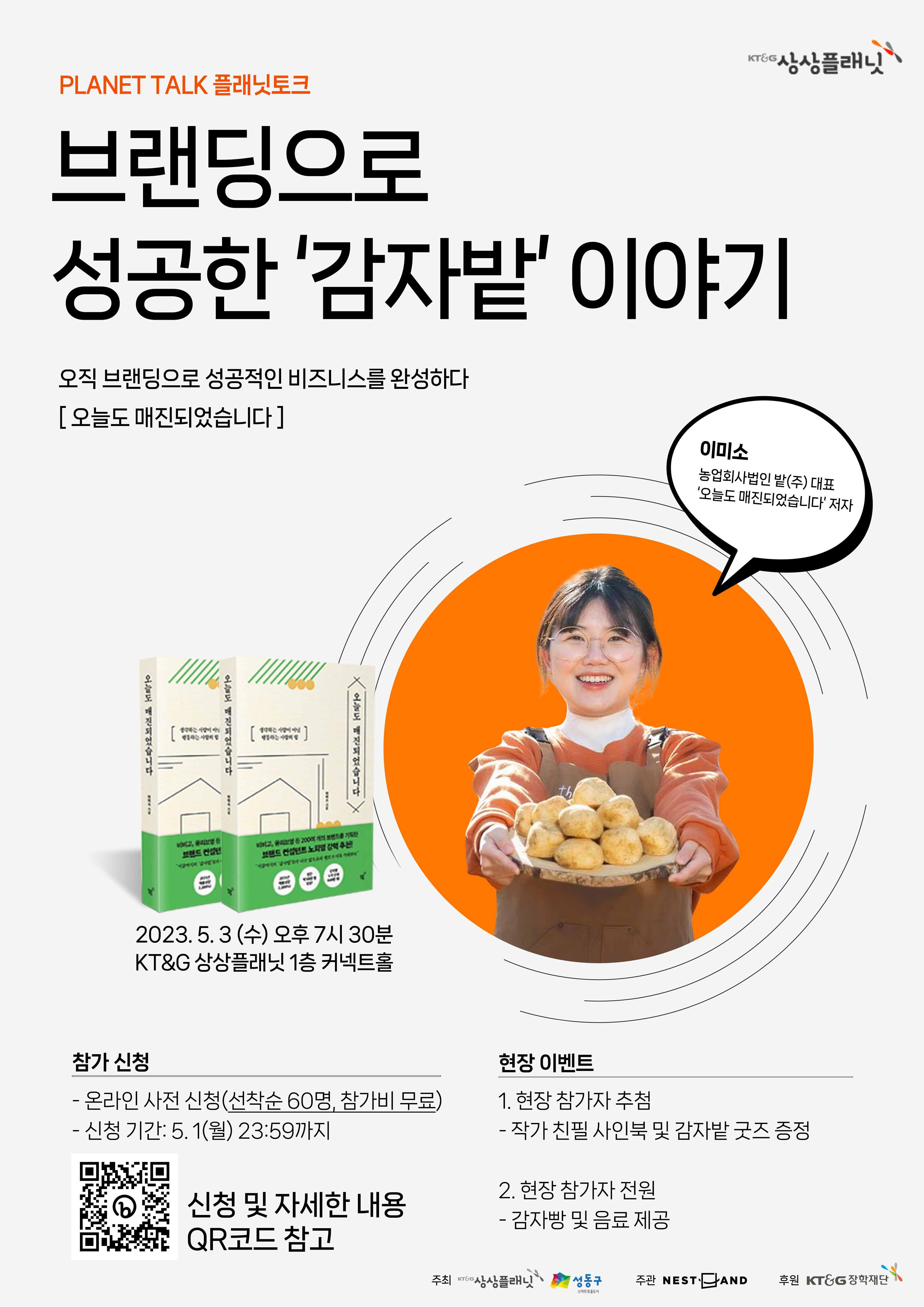 news [행사] 플래닛 토크 : 브랜딩으로 성공한 '감자밭' 이야기 (5/3) by 8번출구 2023. 4. 12. 일시: 2023. 5. 3 (수) 19:30 - 21:00 장소: 상상플래닛 1층 커넥트홀 내용'브랜딩으로 비즈니스하는 법' 강연Q&A 시간 신청온라인 사전 신청(선착순 60명, 참가비 무료)신청 기간. 5.1(월) 23:59 참고 링크 : https://sangsangplanet.oopy.io/planetalk 공유하기 게시글 관리 임팩트얼라이언스 Impact Alliance 관련글 [모집] 사회적경제 x 국제개발협력 인큐베이팅 역량강화 프로그램 (~4/20) [모집] 성동구 소셜벤처 스케일업 프로그램 참여기업(~4/21) [모집] 서울시 사회적경제기업 오픈마켓 기획전 참여기업 (~4/21) [모집] 알파라운드 : 소셜 인턴십 알파프로젝트 - 소셜섹터 인턴십 운영기관 모집 공고 (~04/28) 댓글