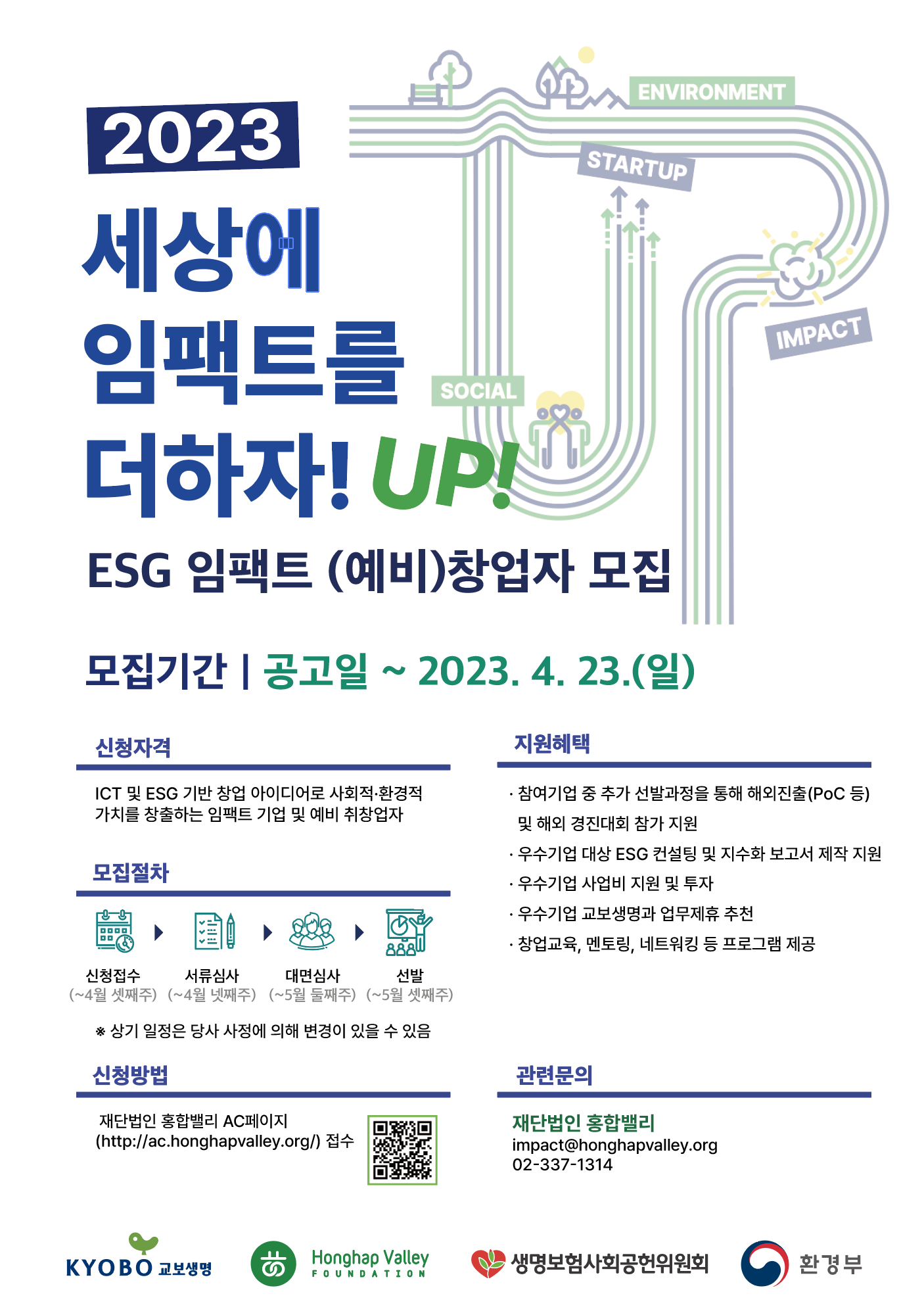 2023년은 위 기관 및 환경부와 함께 ESG 임팩트 기업을 적극적으로 발굴 및 육성하여, 지속가능한 환경 및 사회를 만들기 위한 액셀러레이팅 프로그램을 운영할 계획입니다.