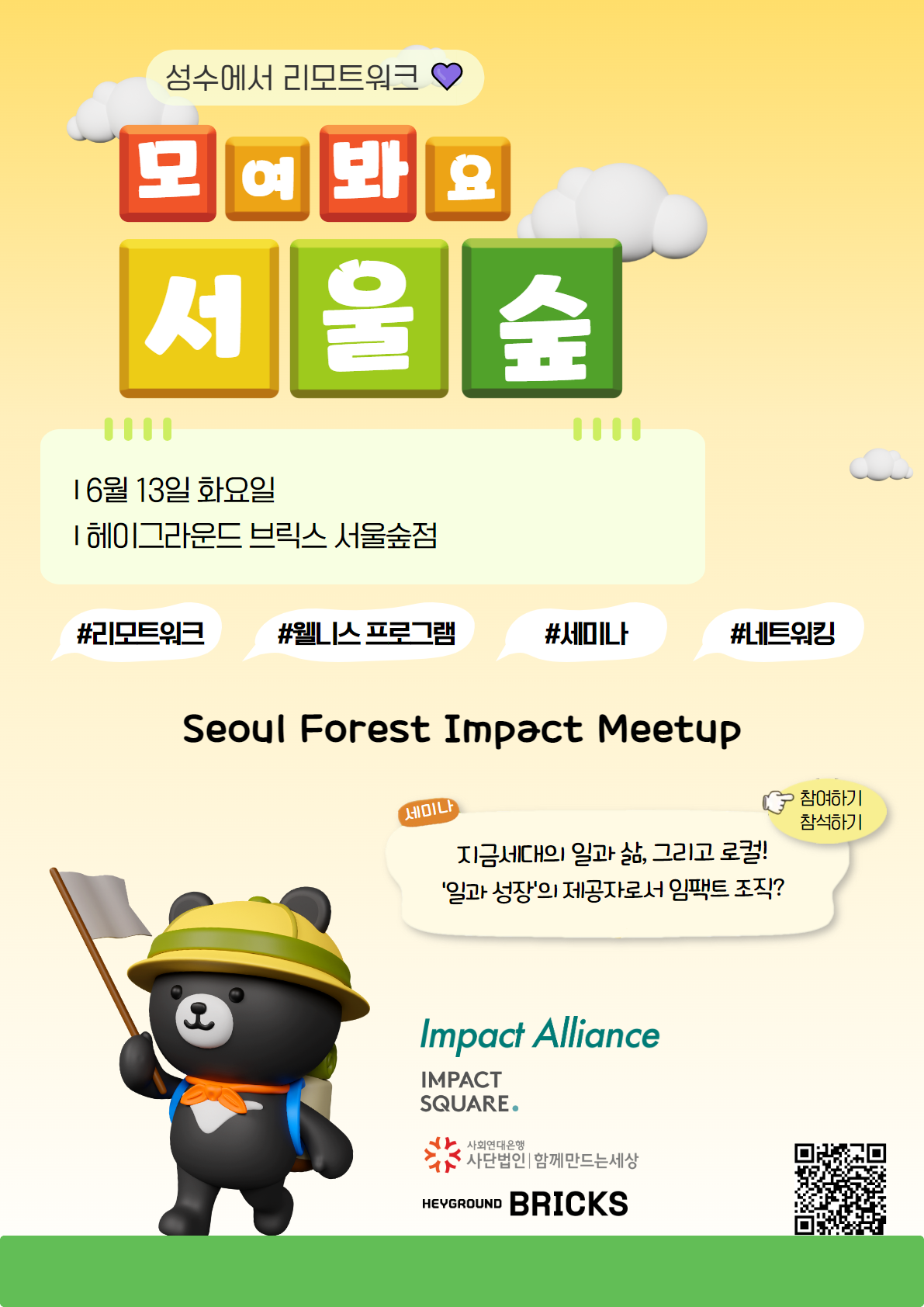 🌳 서울숲 임팩트 밋업(Seoul Forest Impact Meet-up)은 임팩트얼라이언스 회원사들이 상호호혜를 통해 이루어지는 커뮤니티 모임으로 만들어가고자합니다. 진정성이 탁월함이 되도록 서로 도우며 느슨하게 함께 만나요!