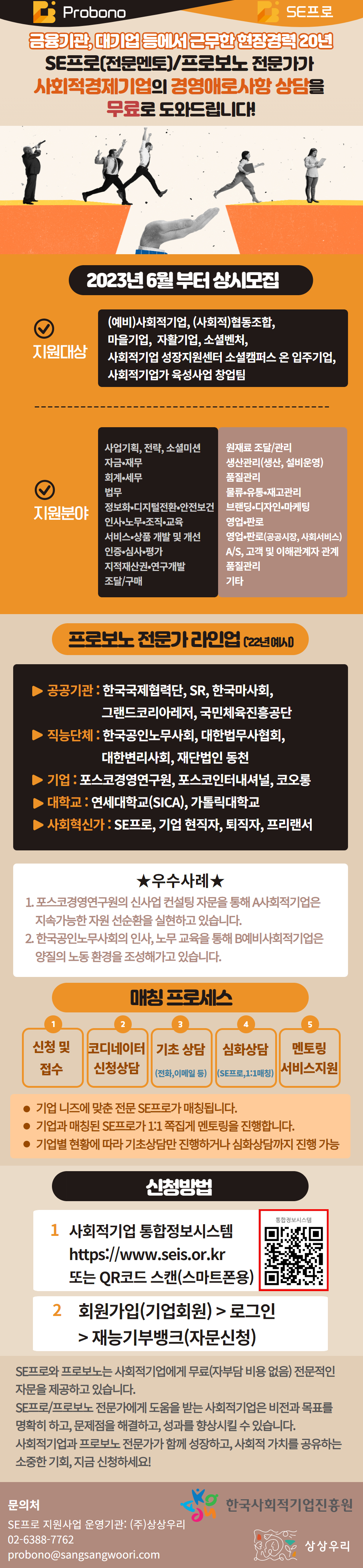 한국사회적기업진흥원에서 주관하는 23년 사회적경제 프로보노 SE프로 지원사업에서 참여기업을 모집합니다.