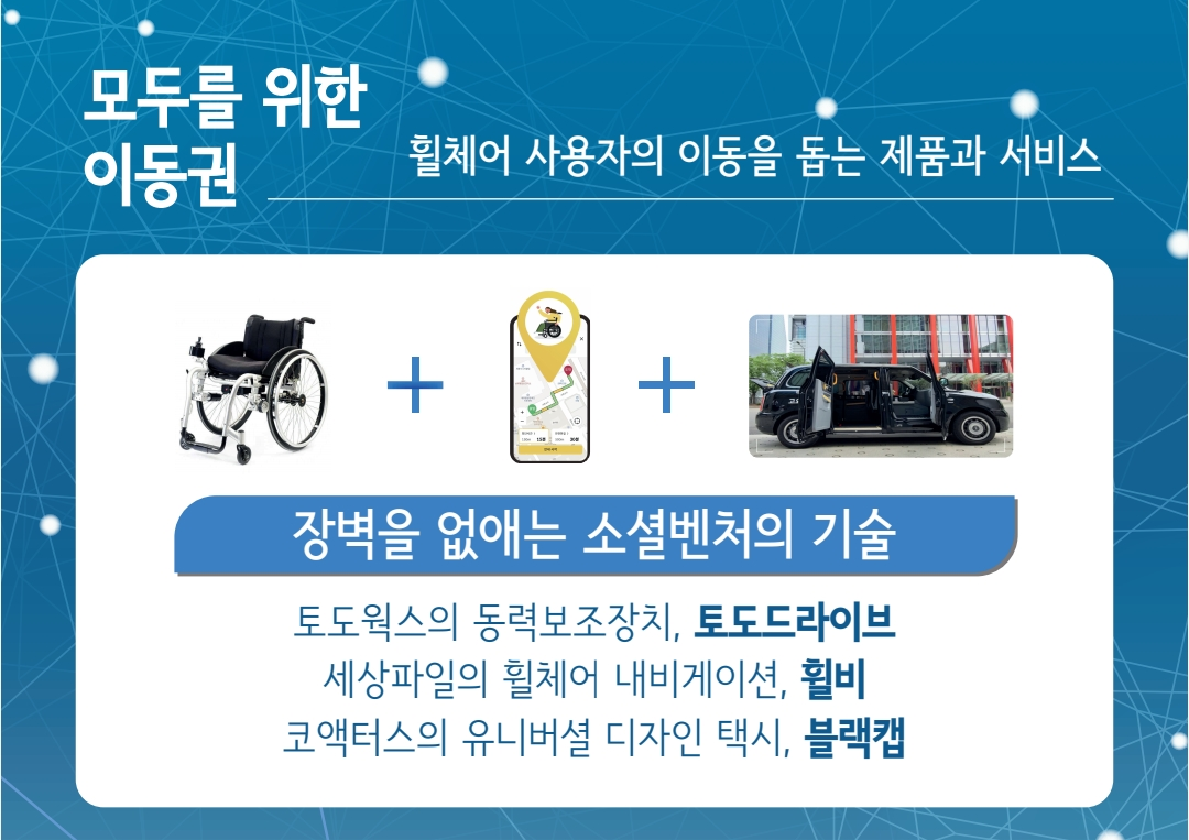 이동, 정보, 일자리, 문화 등 다양한 영역에서 접근성 향상을 통해 장애인이 사회와 경제에 더욱 주체성을 가지게 되고 더 많은 사람들이 더욱 평등한 기회를 가지는 사례들이 임팩트 조직들의 도전을 통해 축적되고 있습니다.