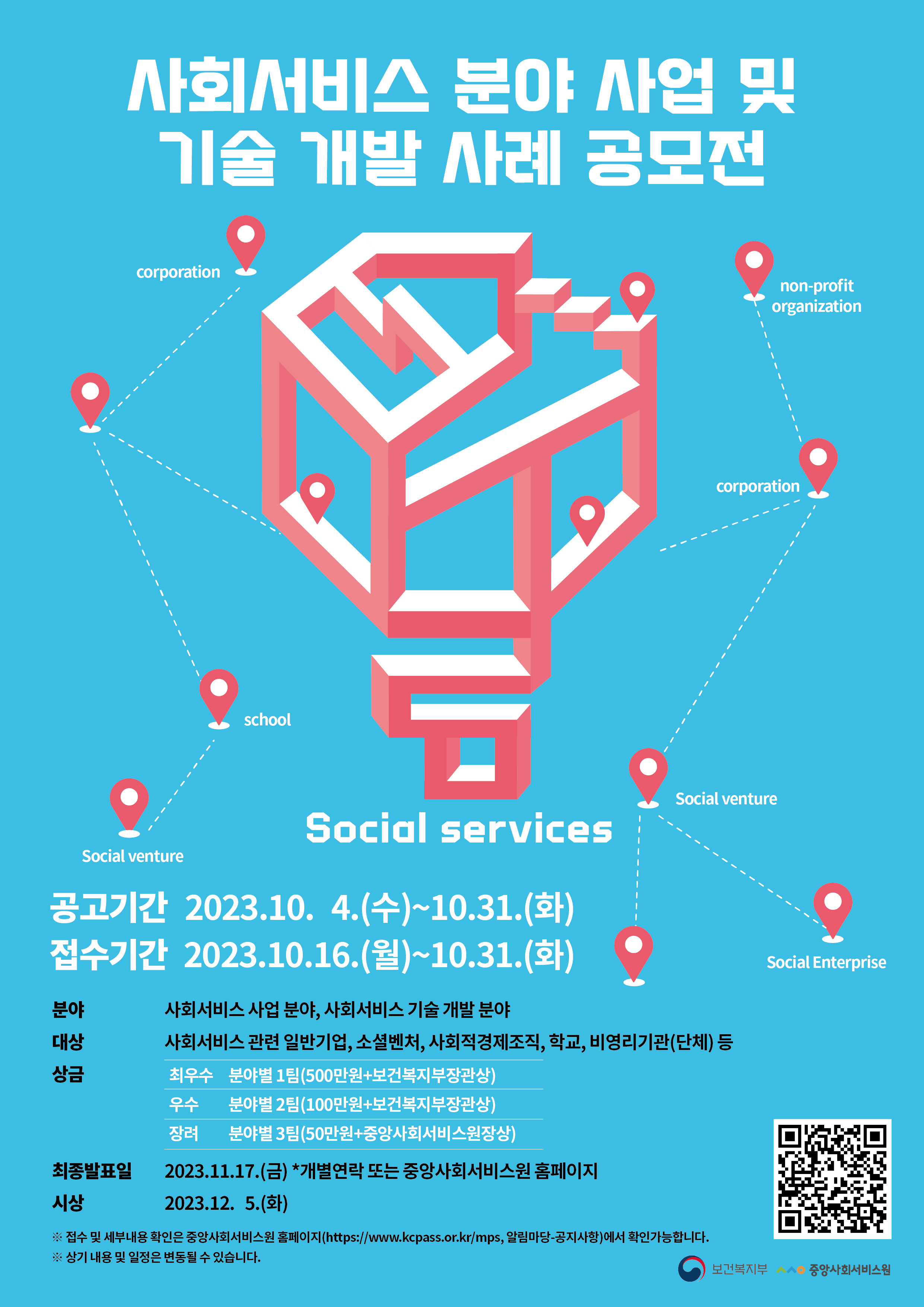 * 사회서비스 분야 사업 및 기술 개발 사례 공모전 신청 접수: https://moaform.com/q/N1j1bQ