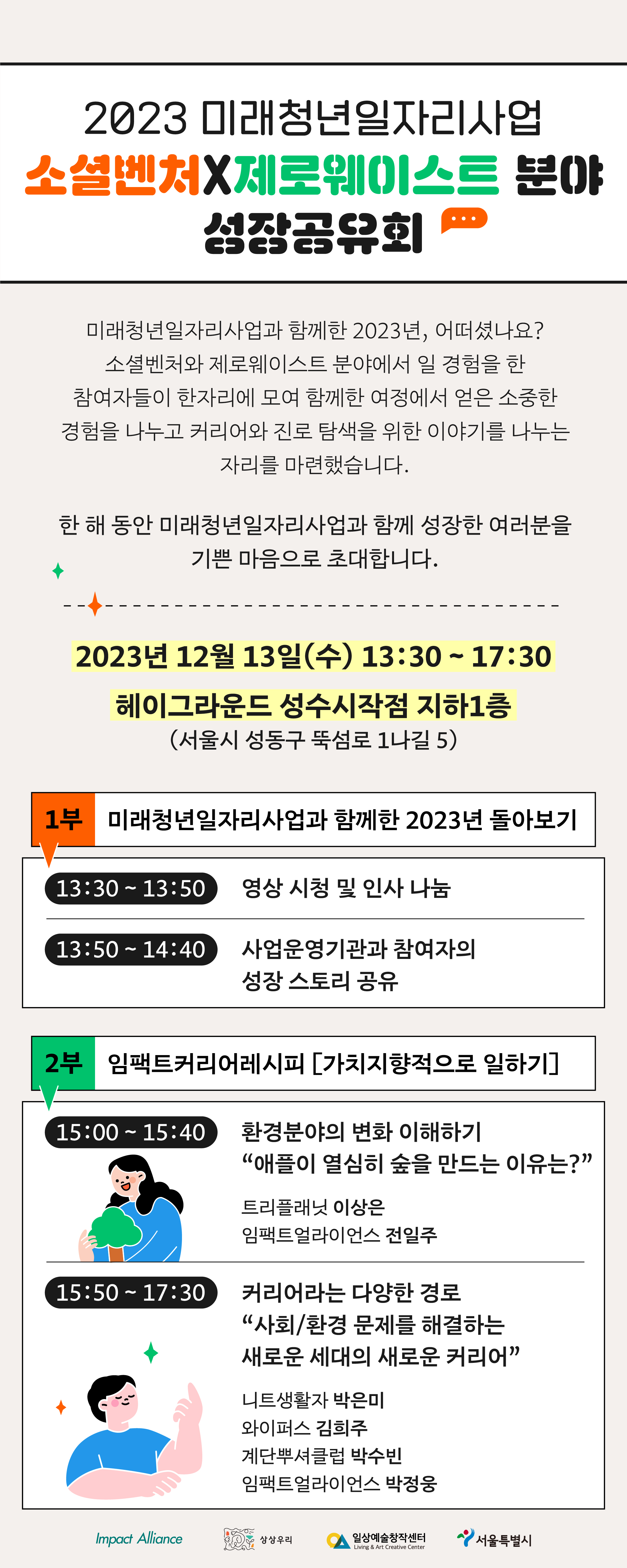 지난 12월 13일, 헤이그라운드 브릭스 성수점에서 ‘2023 임팩트 커리어 레시피 : 가치지향적으로 일하기’가 열렸습니다. 서울시 미래청년일자리사업 참여자(소셜벤처, 제로웨이스트 분야)를 대상으로 한 이번 행사는 임팩트 지향 조직에서 일하는 실무자 또는 대표의 생생한 이야기를 통해 청년에게 커리어에 대한 다양한 관점과 사례를 소개하고자 마련되었습니다. 2023 서울시 미래청년일자리사업 성장공유회의 일환으로 진행되었으며, 임팩트얼라이언스와 일상예술창작센터, 상상우리가 함께 했습니다.
