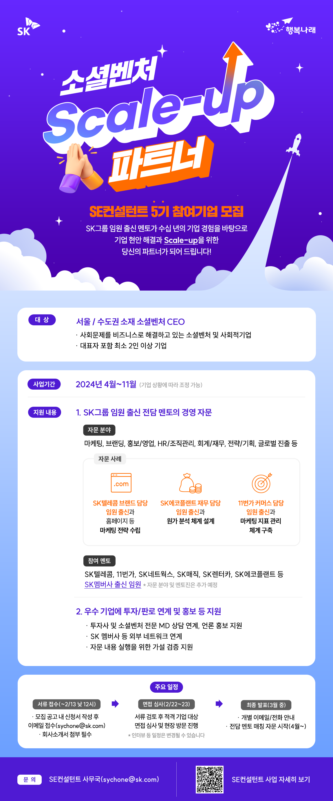 📣 SK와 행복나래에서 소셜벤처의 Scale-up을 지원하는 SE컨설턴트 사업의 5기 참여기업 모집합니다.