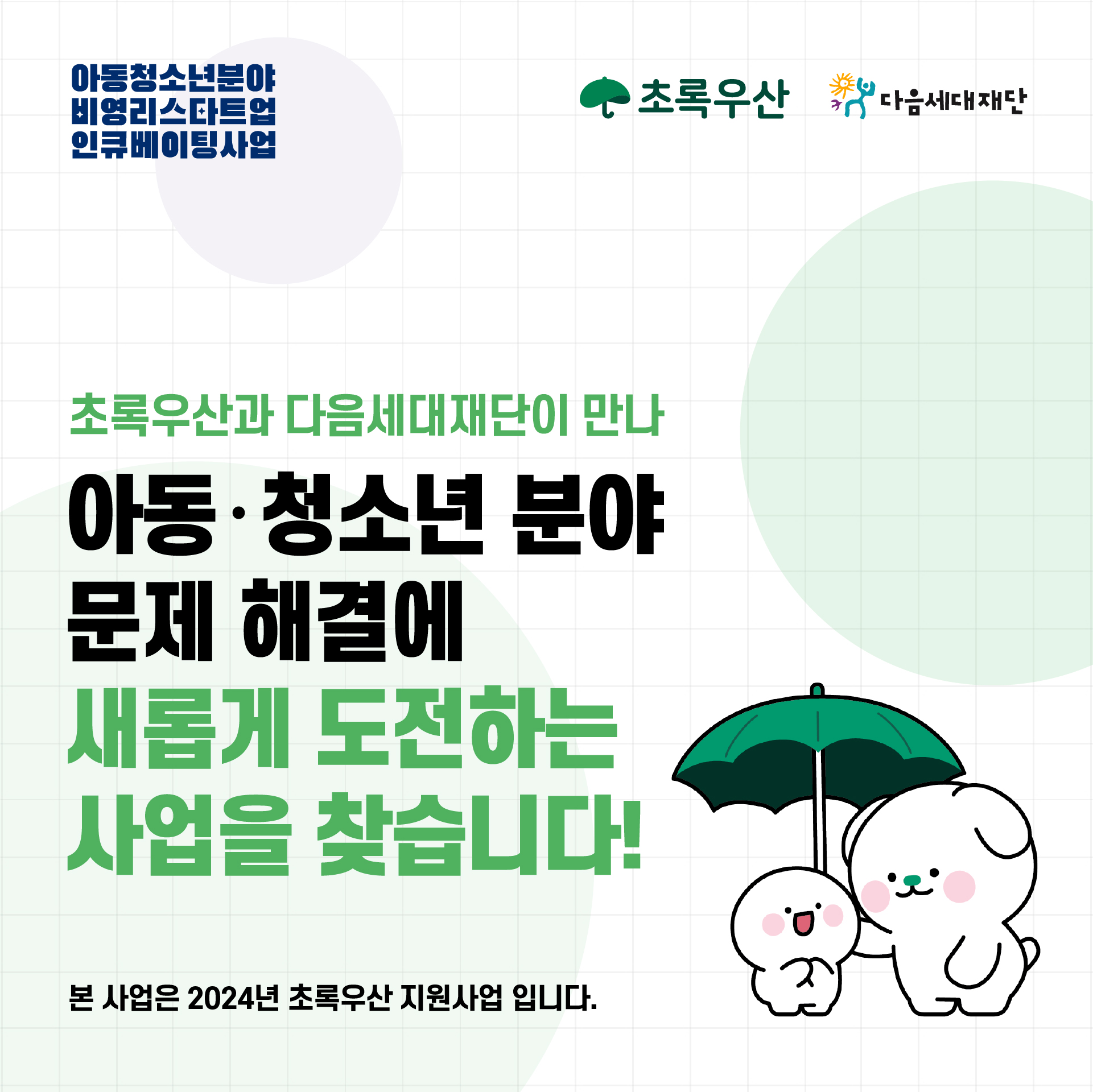 돌봄, 자립, 교육, 건강 등 다양한 영역에서 아동복지사업을 펼쳐 온 초록우산의 전문성과 40 여 개 비영리스타트업을 육성해 온 다음세대재단의 노하우를 기반으로 아동·청소년 분야에서 새로운 도전을 펼쳐갈 비영리조직을 기다립니다.