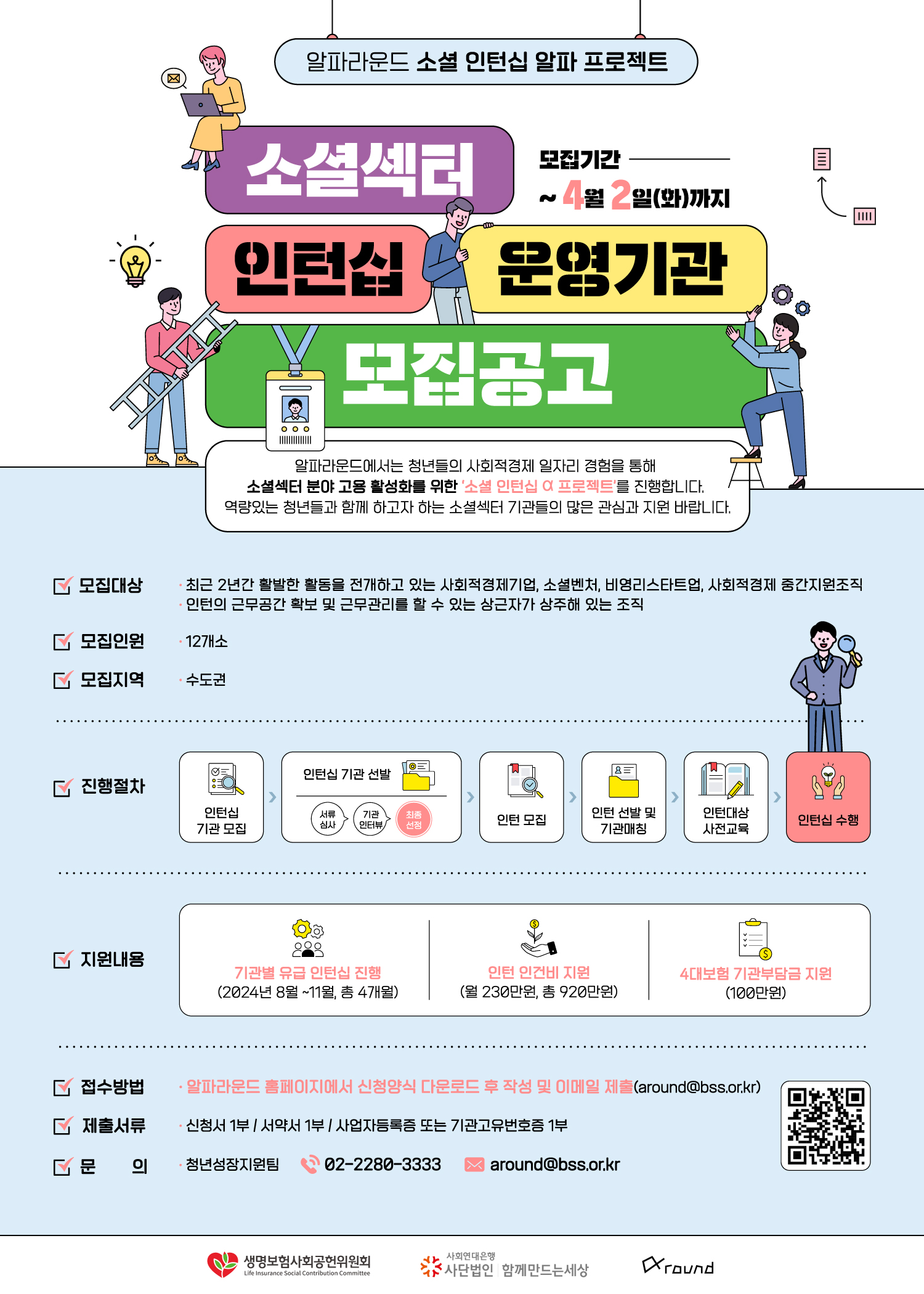 알파라운드에서는 청년들의 사회적경제 일자리 경험을 통해 소셜섹터 분야 고용 활성화를 위한 ‘소셜 인턴십 α 프로젝트’를 진행합니다. 역량있는 청년들과 함께 하고자 하는 소셜섹터 기관들의 많은 관심과 지원 바랍니다.