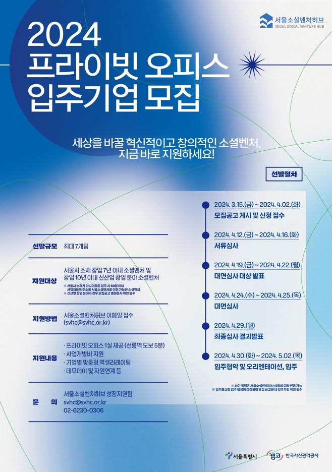 - 서울특별시 소재 창업 7년 이내 소셜벤처(법인) 또는 신산업 창업 분야의 경우 최대 10년 이내 소셜벤처 최대 7팀 선발 예정
