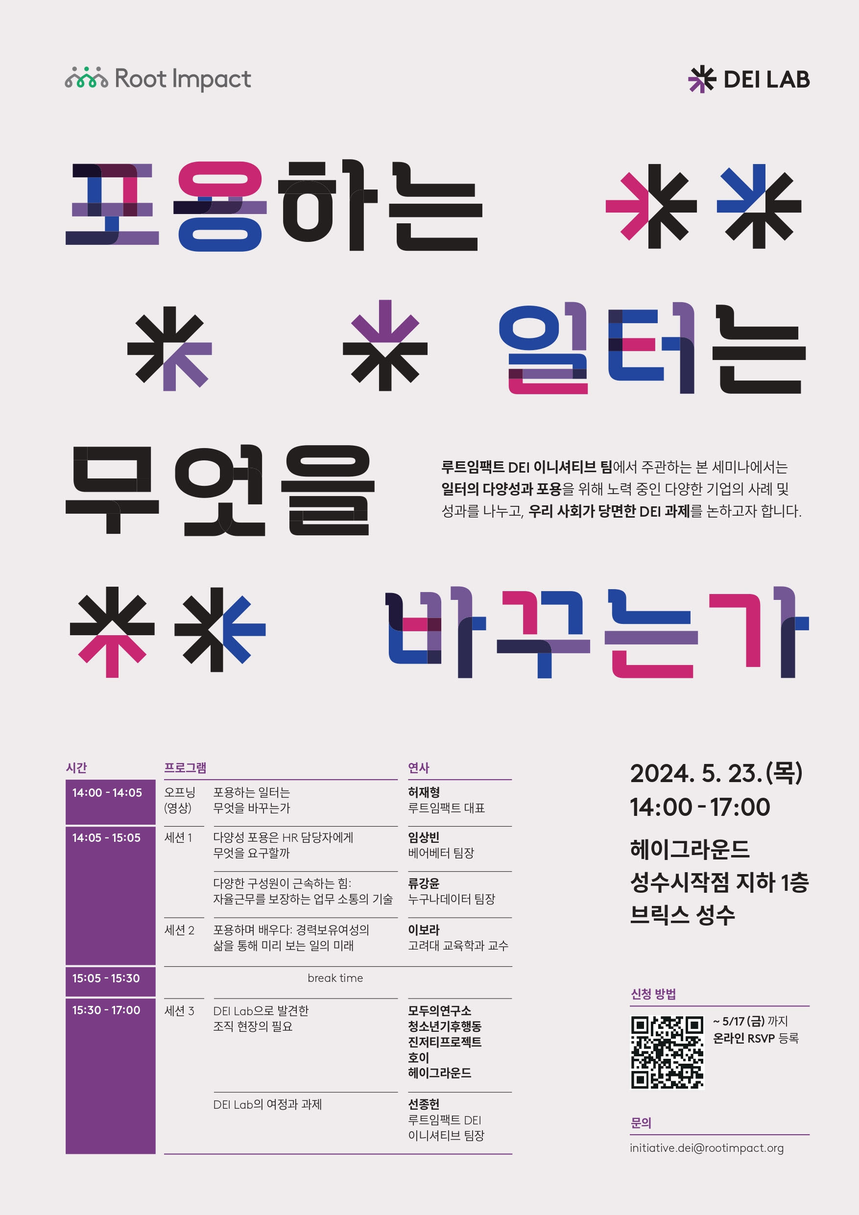 루트임팩트 DEI (Diversity, Equity and Inclusion) 이니셔티브 팀에서 일터의 다양성과 포용을 위해 노력 중인 다양한 기업 사례를 공유하고 우리 사회가 당면한 DEI 과제를 논하는 세미나를 개최합니다.