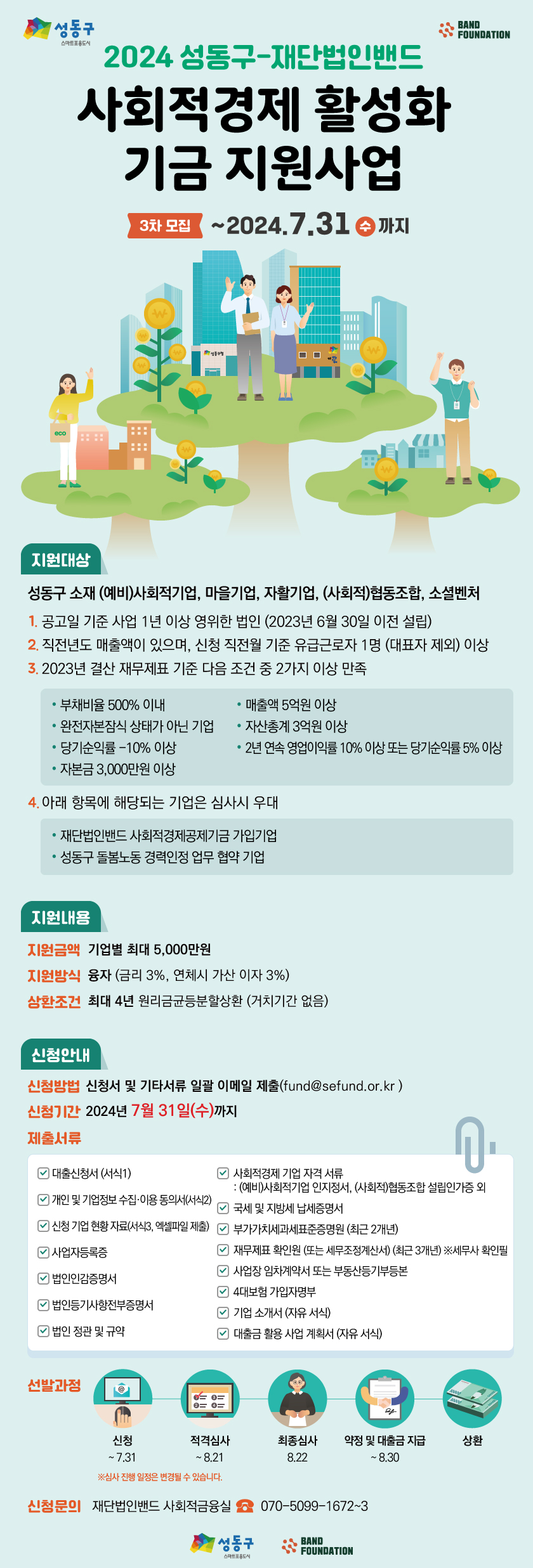 재단법인밴드가 2023년 성동구 사회적경제 활성화 기금 운영 기관으로 성동구 소재 사회적경제 조직을 대상으로 융자 지원 사업을 진행합니다.