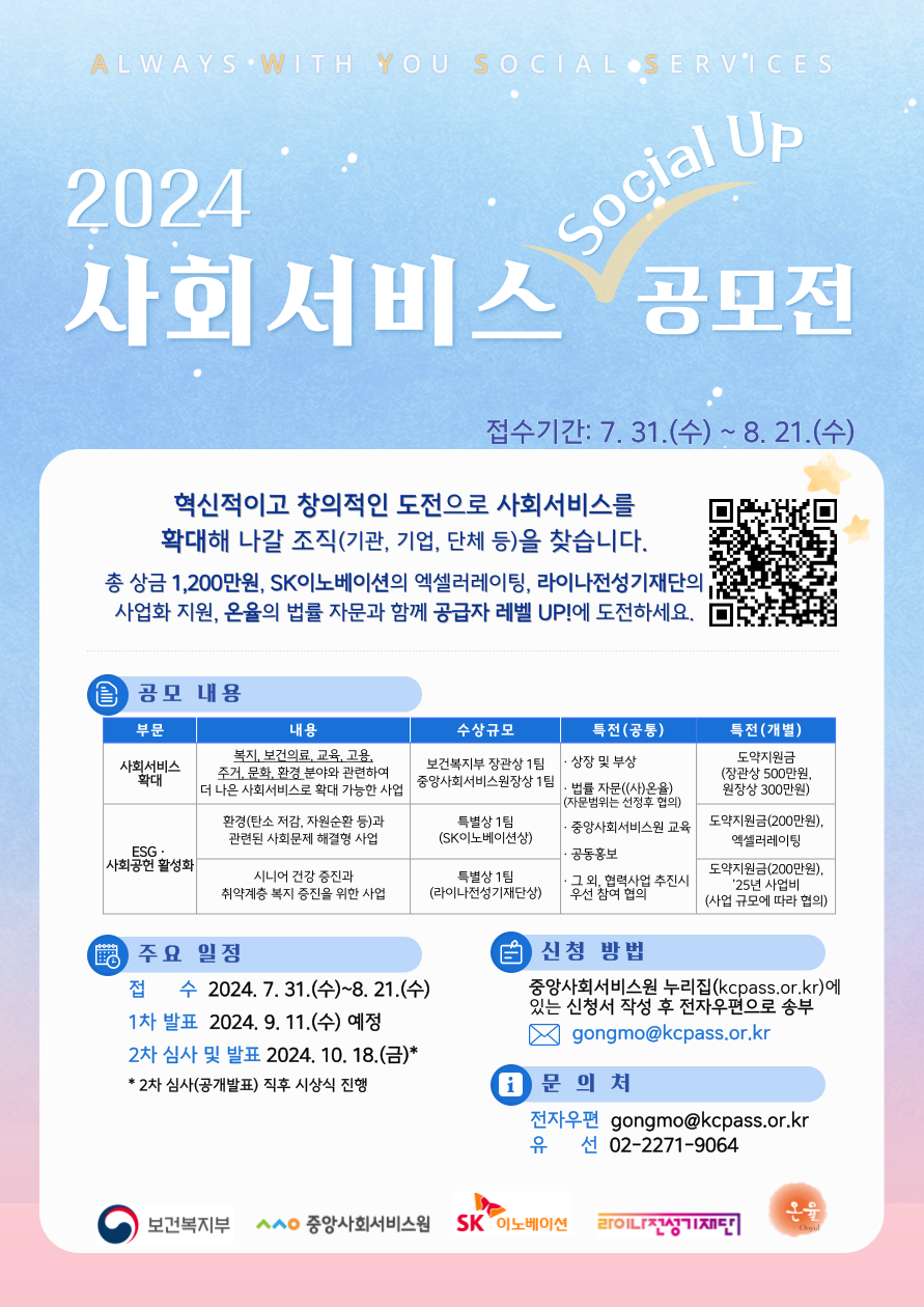 혁신적이고 창의적인 도전으로 질 높은 사회서비스를 확대해 나갈 사회서비스 공급자 발굴을 위한 「2024 사회서비스 소셜업(Social Up) 공모전」에 참여할 기관을 다음과 같이 모집합니다.