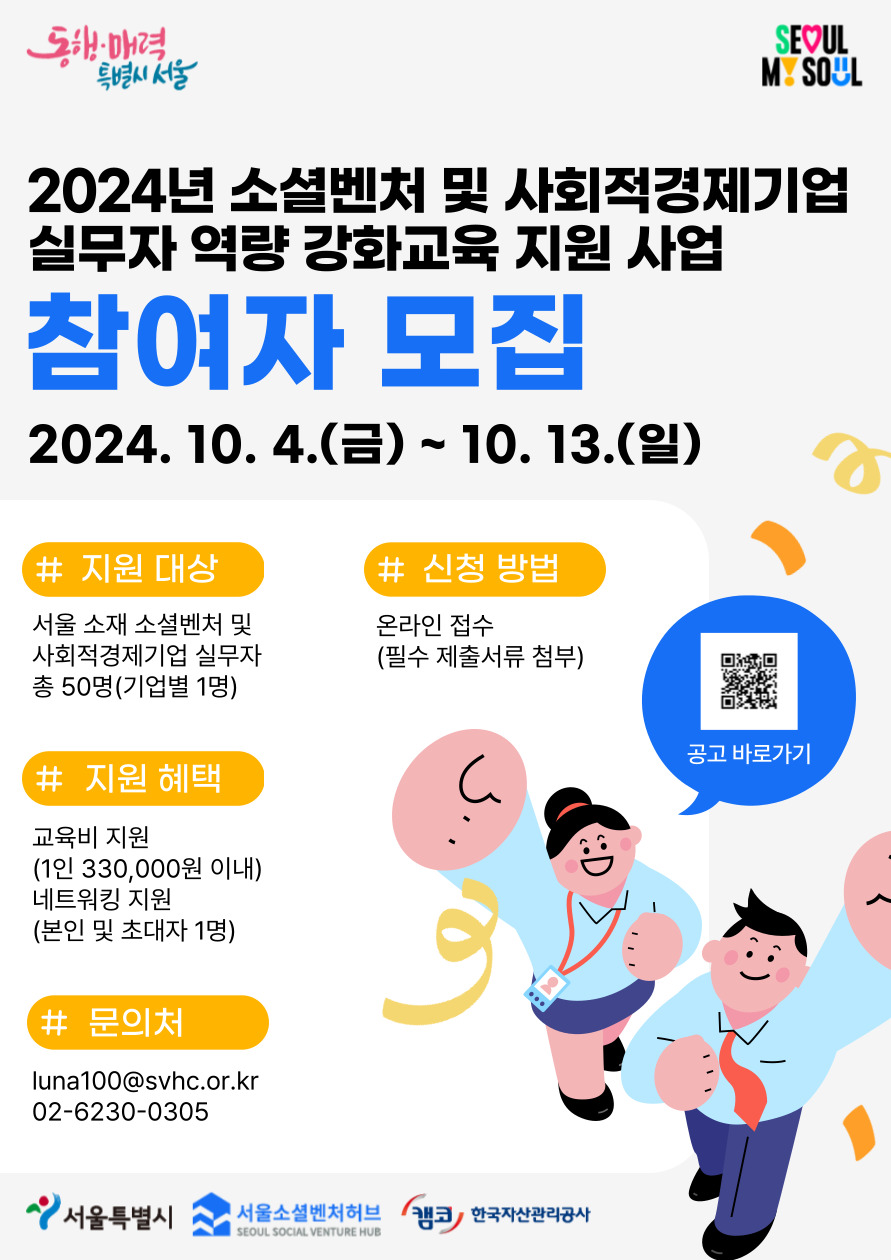 - 지원대상: 서울 소재 소셜벤처 및 사회적경제기업에서 근무하는 실무자