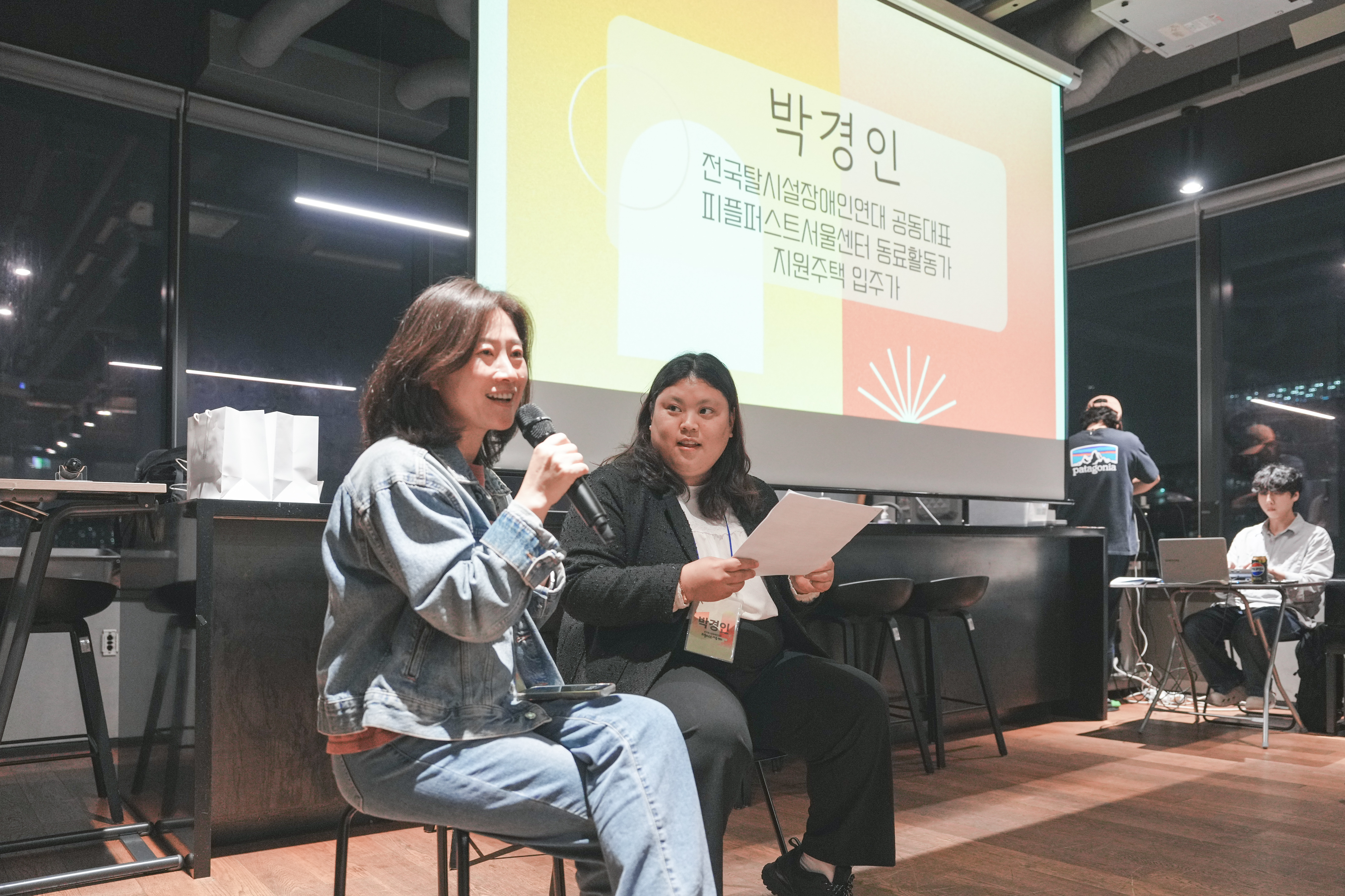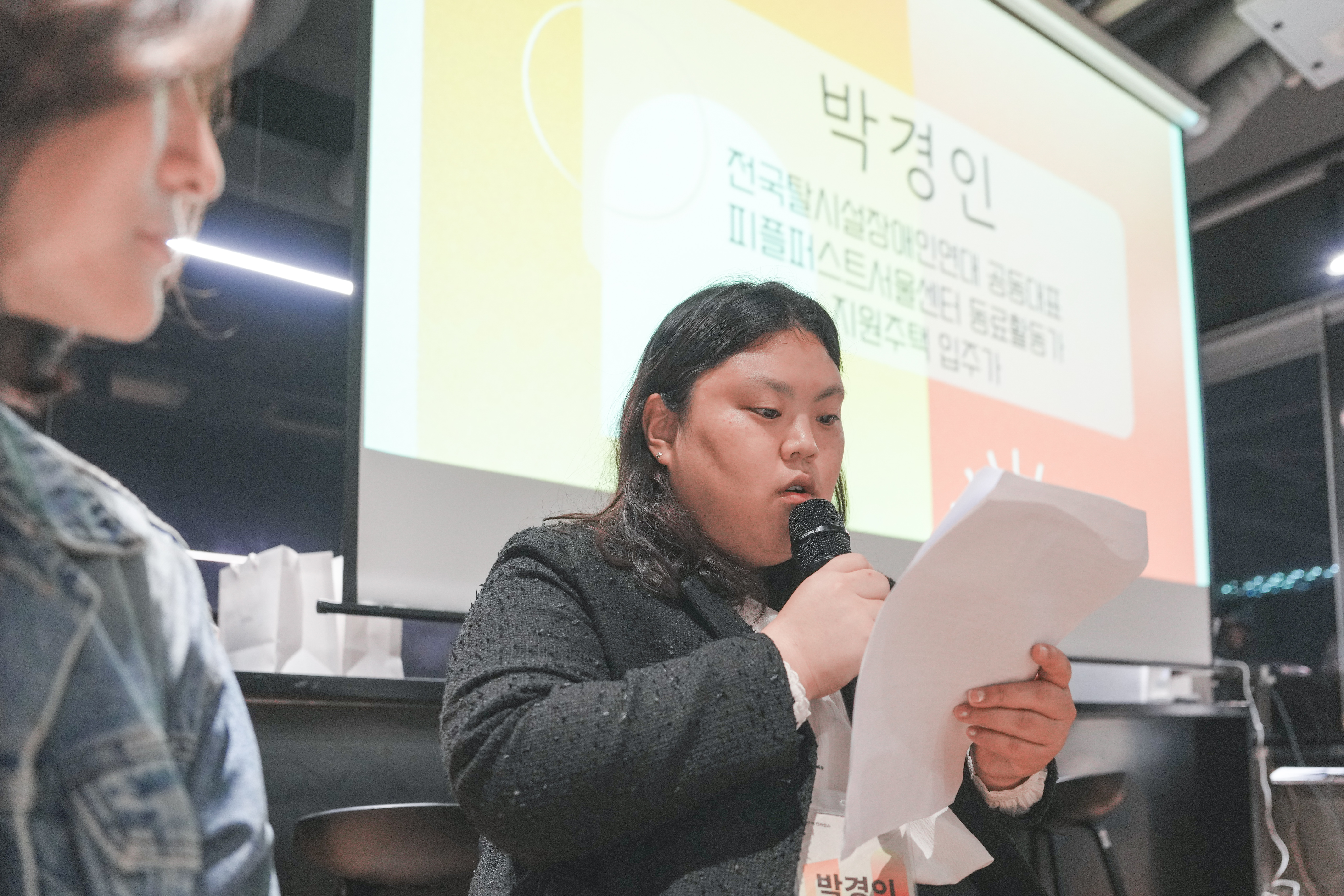 1부에서는 박경인 전국탈시설장애인연대 공동대표와 이아름 사단법인 열린복지 지원주택 서비스 코디네이터가 각각의 경험과 활동에 대해 이야기를 나눴습니다.