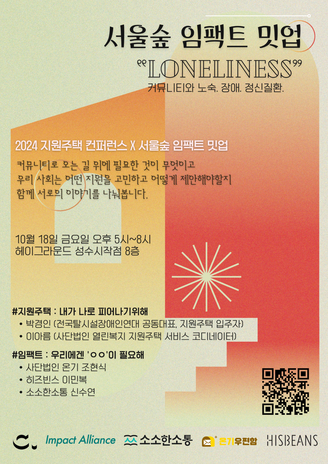 2024년 10월 10일, 서울숲 임팩트 밋업이 '헤이그라운드 성수시작점'에서 "Loneliness : 커뮤니티로 오는 길 위에 필요한 것들"이라는 주제로 진행되었습니다.