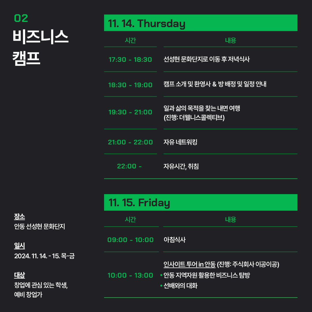 - 일시: 2024년 11월 14일(목) 18:00-15일(금) 13:00 (1박 2일)
