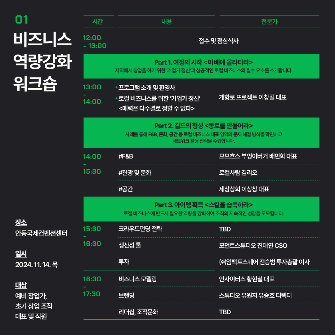 - 프로그램: 로컬 비즈니스 인사이트 투어 in 안동, 리트릿을 통한 자아 탐구, 서로의 생각을 나누는 네트워킹