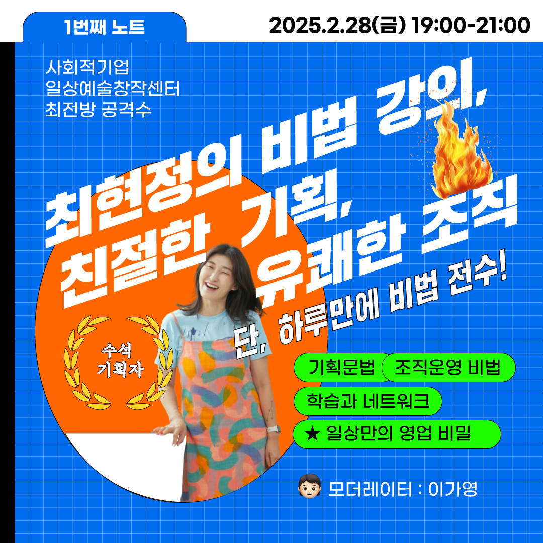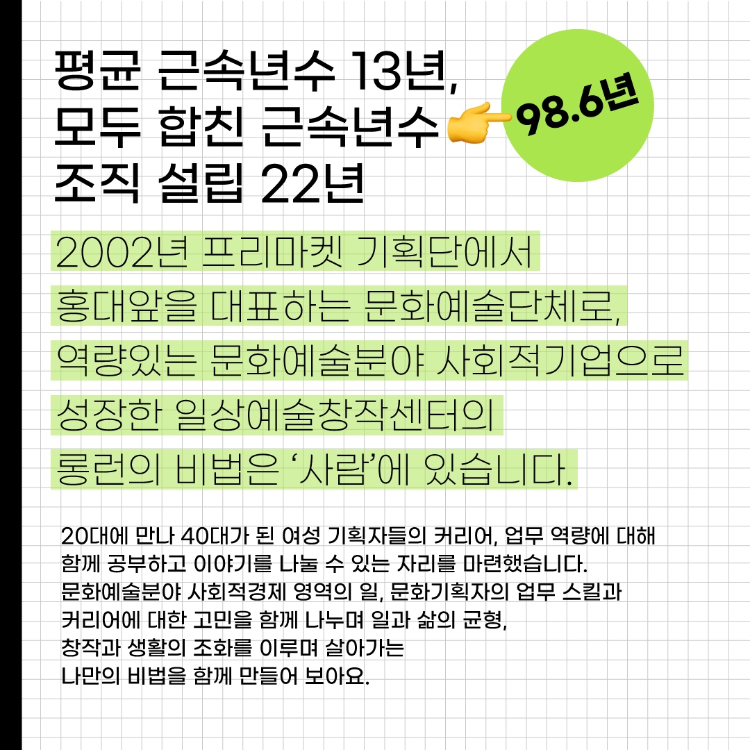 2002년 프리마켓 기획단에서 홍대앞을 대표하는 문화예술단체로, 역량있는 문화예술분야 사회적기업으로 성장한 일상예술창작센터의 롱런의 비법은 '사람'💪🏼에 있습니다.