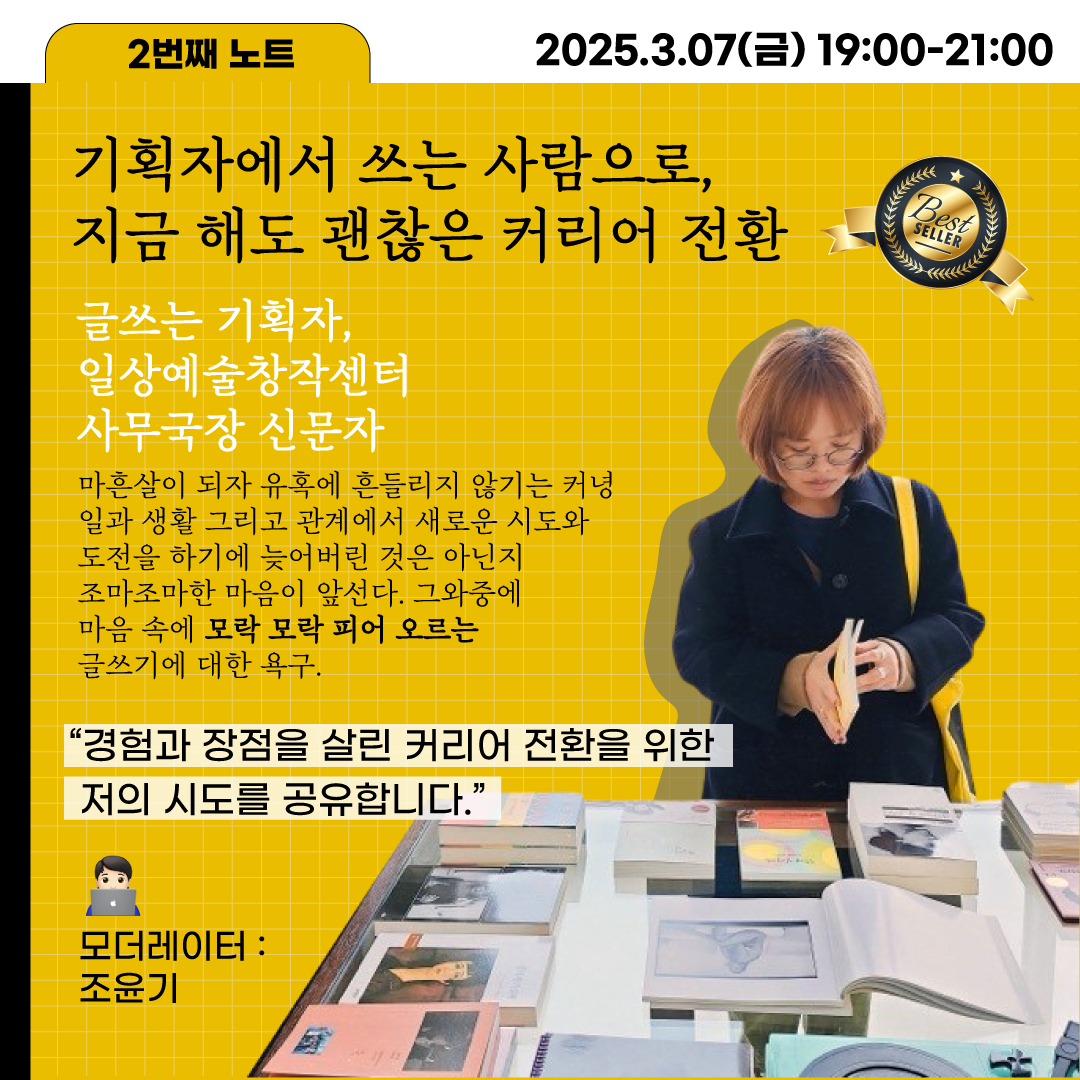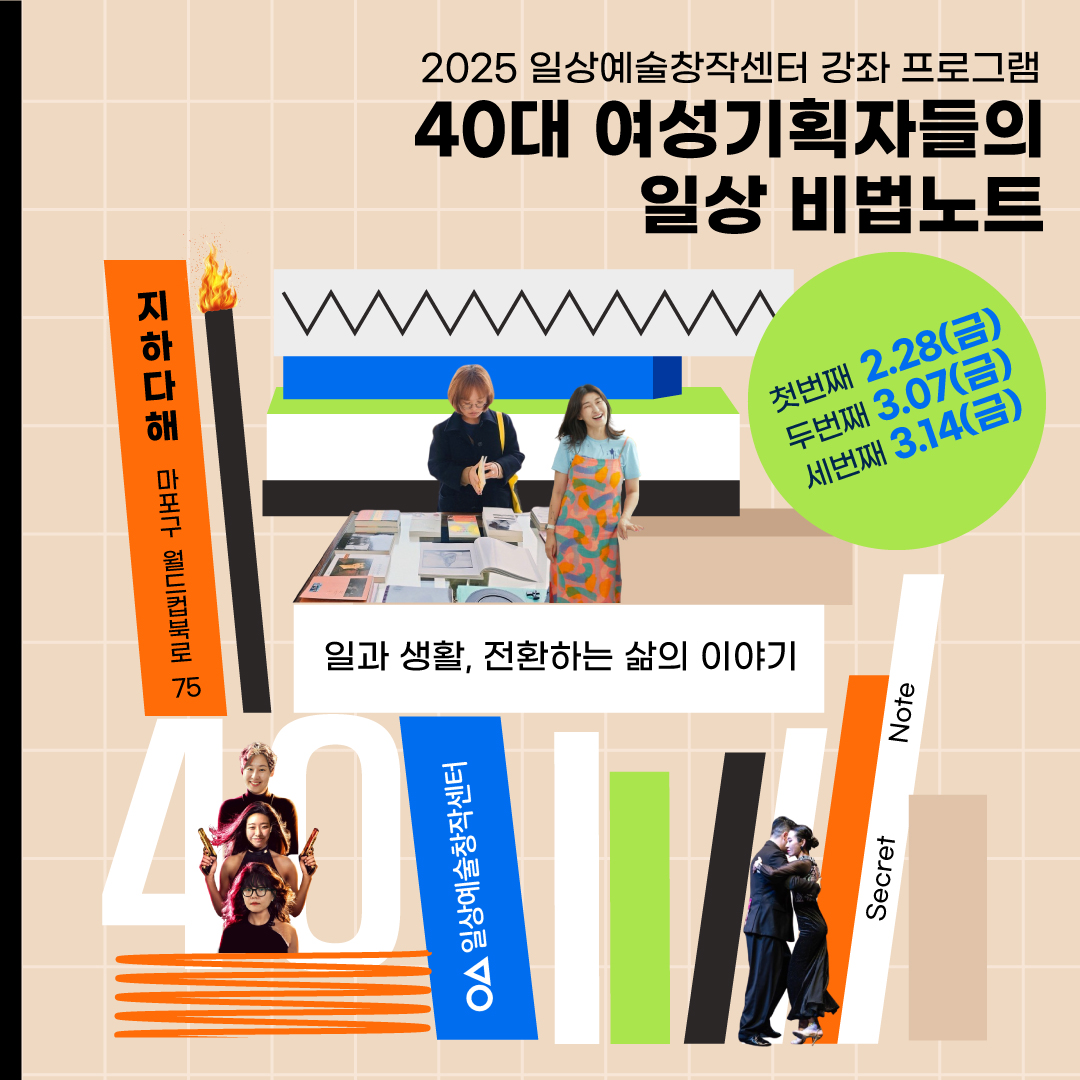 20대에 만나 40대가 된 여성 기획자들의 커리어, 업무 역량에 대한 고민을 나누며 일과 삶의 균형, 창작과 생활의 조화🤸🏼🤸🏼♂️🤸🏼♀️를 이루며 살아가는 나만의 비법을 함께 공부하고 만들어 보아요!