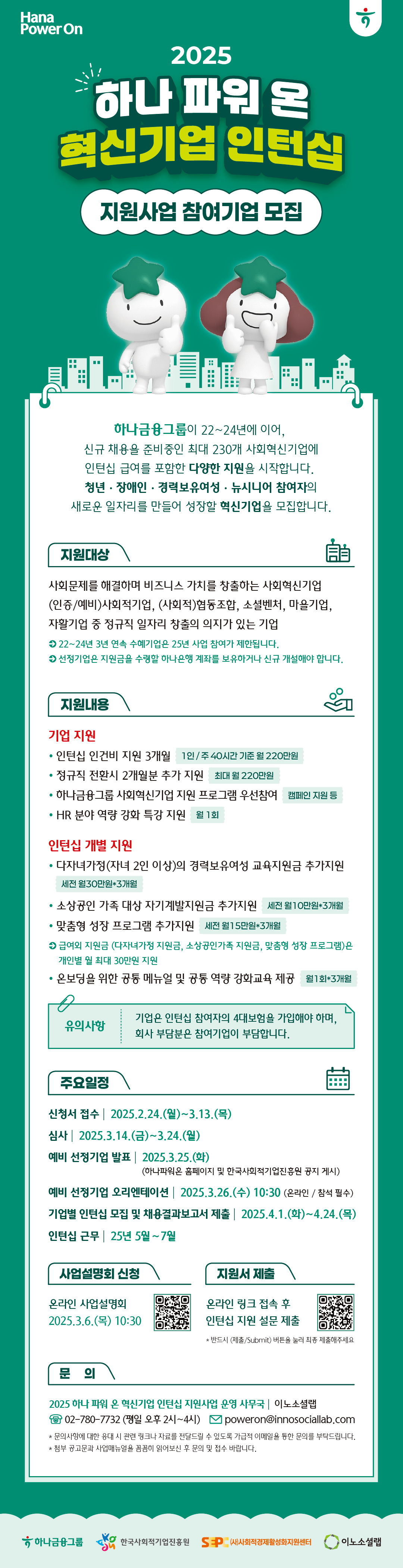 하나금융그룹과 한국사회적기업진흥원은 사회문제를 해결하는 혁신기업의 성장을 응원하며,  「2025 하나 파워온 혁신기업 인턴십 지원사업」을 시작합니다. 신규 채용을 준비하고 있는 혁신기업의 많은 관심 부탁드립니다.