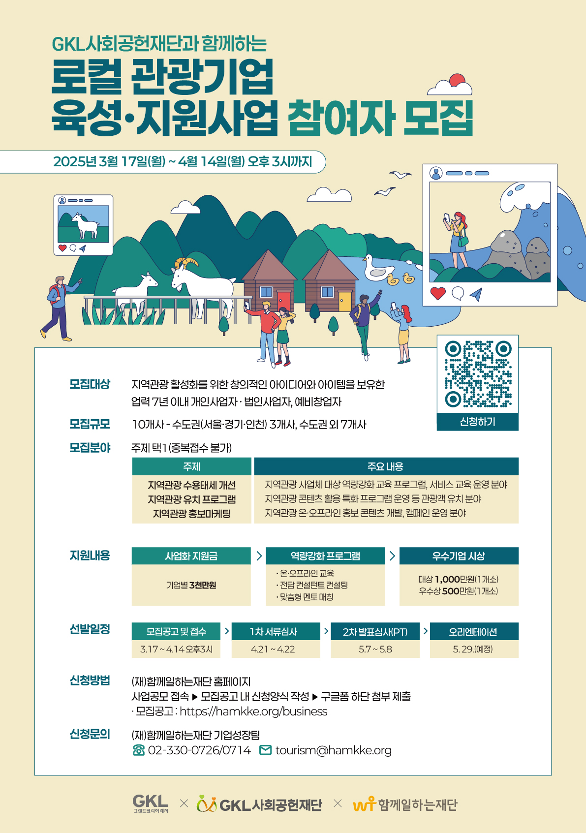 GKL사회공헌재단과 함께일하는재단은 지역관광 활성화를 위한 창의적인 아이디어와 아이템을 보유한 예비창업자를 발굴하고 업력 7년 이내 개인 및 법인사업자를 육성·지원하기 위해 「GKL 로컬 관광기업 육성·지원 사업」의 참가자를 다음과 같이 모집하오니 많은 관심과 참여 부탁드립니다.