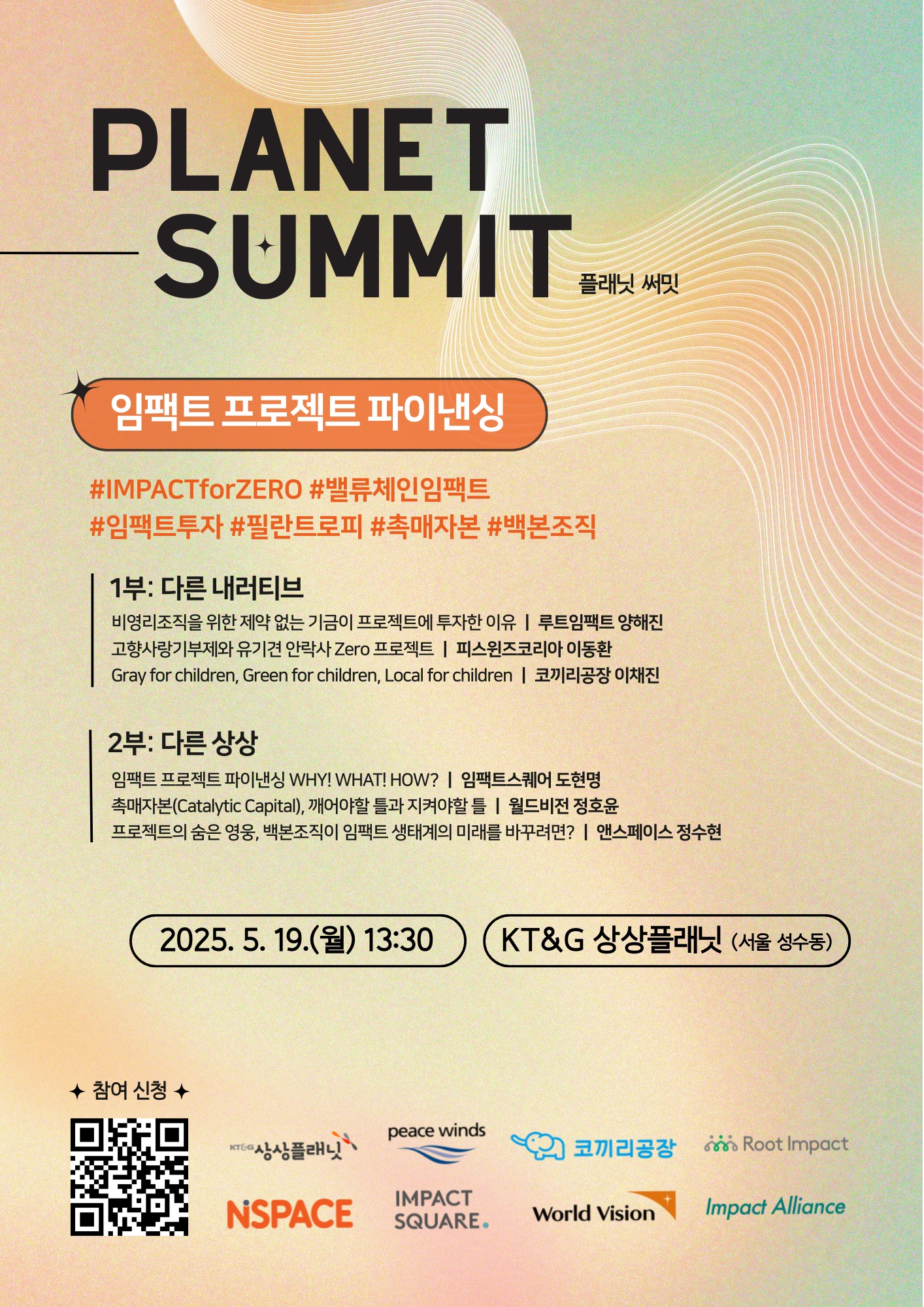 이번 플래닛 써밋에서는 ‘임팩트 프로젝트 파이낸싱’의 개념을 현실에 맞춰 심도 있게 논의하고, 이미 국내외에서 시도된 사례와 경험을 공유하고자 합니다. 이를 통해 다양한 이해관계자들이 영역을 넘나드는 협업 모델을 구체화할 수 있습니다. 이는 프로젝트 파이낸싱 중심의 펀드레이징 전략, 촉매자본 활용, 그리고 민간 주도 방식에서의 중추조직(backbone organization) 역할에 대한 공감대 형성으로 이어질 것입니다. 장기적(long-term impact)이고 구조적(system change)인 접근을 통해 임팩트 생태계의 역량을 한층 높이는 기회가 될 것입니다.