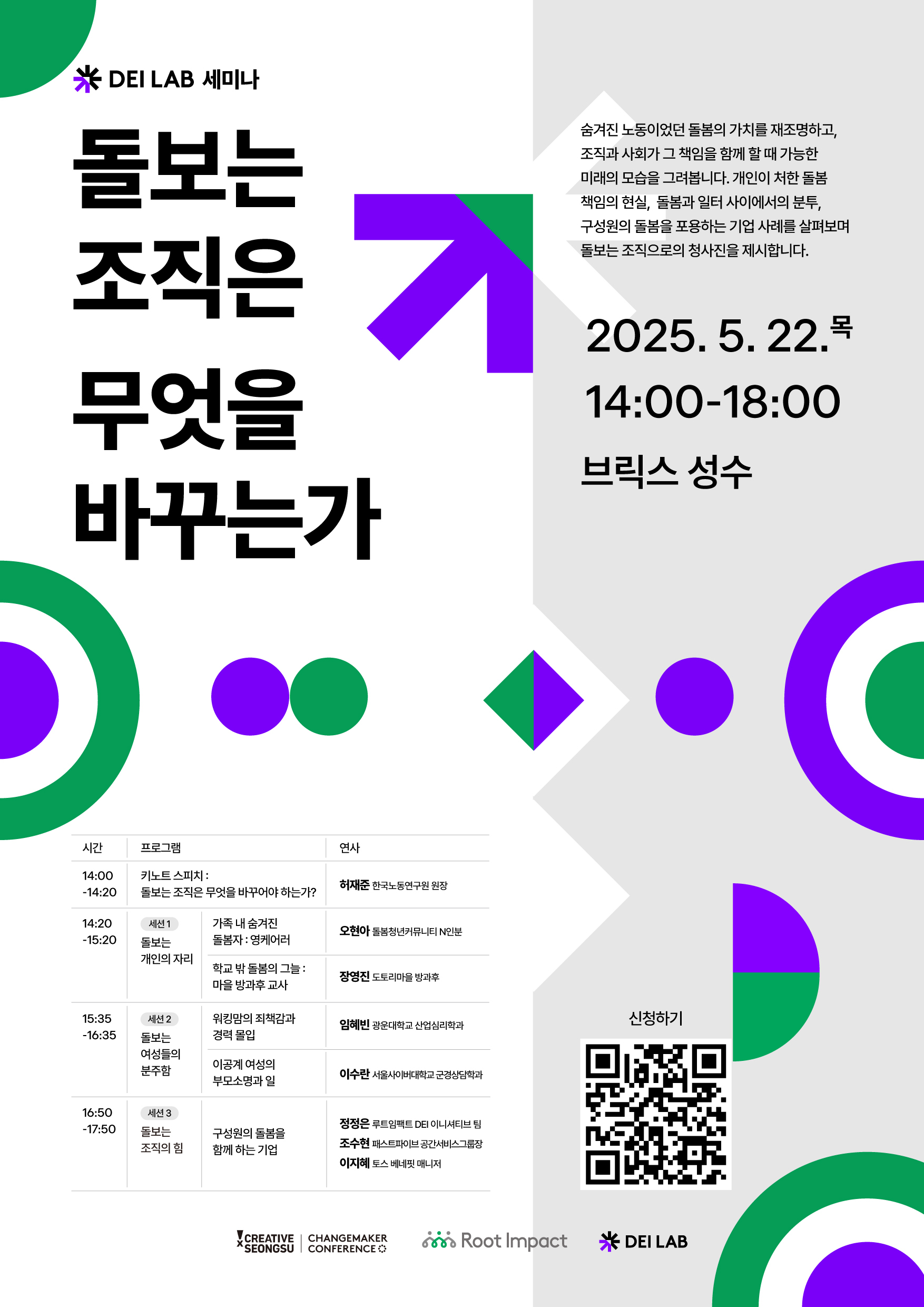 돌보는 개인의 내러티브부터 돌보는 여성 연구, 돌봄을 포용하는 조직 사례까지 돌봄에 대한 폭넓은 인사이트를 공유하는 자리에 많은 관심과 참여 부탁드립니다.