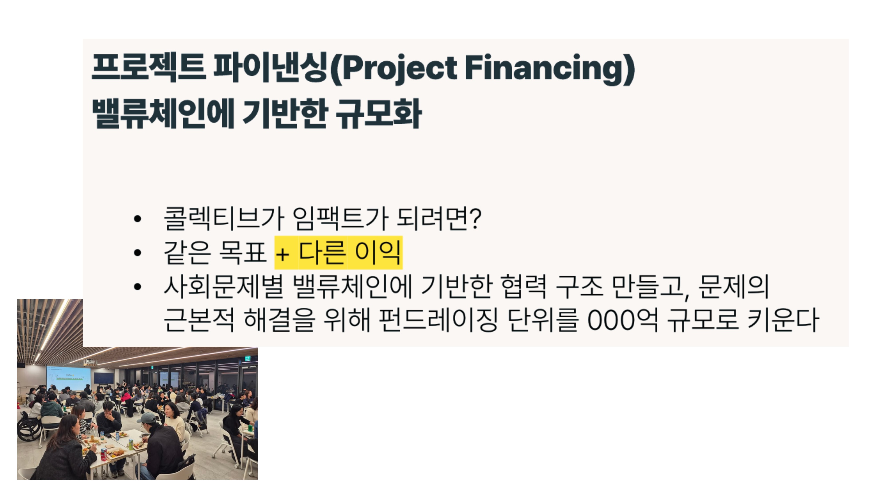 이와 같은 한계를 극복하기 위해서는 임팩트 생태계의 패러다임 전환이 필요합니다. 이제는 “누가 주도하느냐”를 따지기보다, “어떤 공동의 목표를 어떻게 함께 달성할 것인가”에 초점을 맞춰야 합니다. 이를 위해 다양한 조직들이 각자의 전문성을 살리면서 가치사슬 전반을 아우르는 협력 구조를 구축하고, 개별 조직 단위가 아닌 프로젝트 단위로 대규모 자금을 마련하는 방안을 모색해야 합니다. 이러한 프로젝트 파이낸싱 중심의 접근은 중·소규모 조직이 다수인 한국 환경에서 특히 효과적일 수 있습니다. 글로벌 임팩트 생태계의 경험이 보여주듯이, 명확한 목표를 가진 프로젝트에 여러 주체가 참여하고 자금을 결집하면 사회문제를 보다 구조적으로 해결할 수 있는 잠재력이 커집니다. 이제 임팩트 생태계는 “다른 내러티브, 다른 상상”을 바탕으로 협업 기반의 프로젝트 금융 전략을 논의하고 실천에 옮길 단계에 와 있습니다.