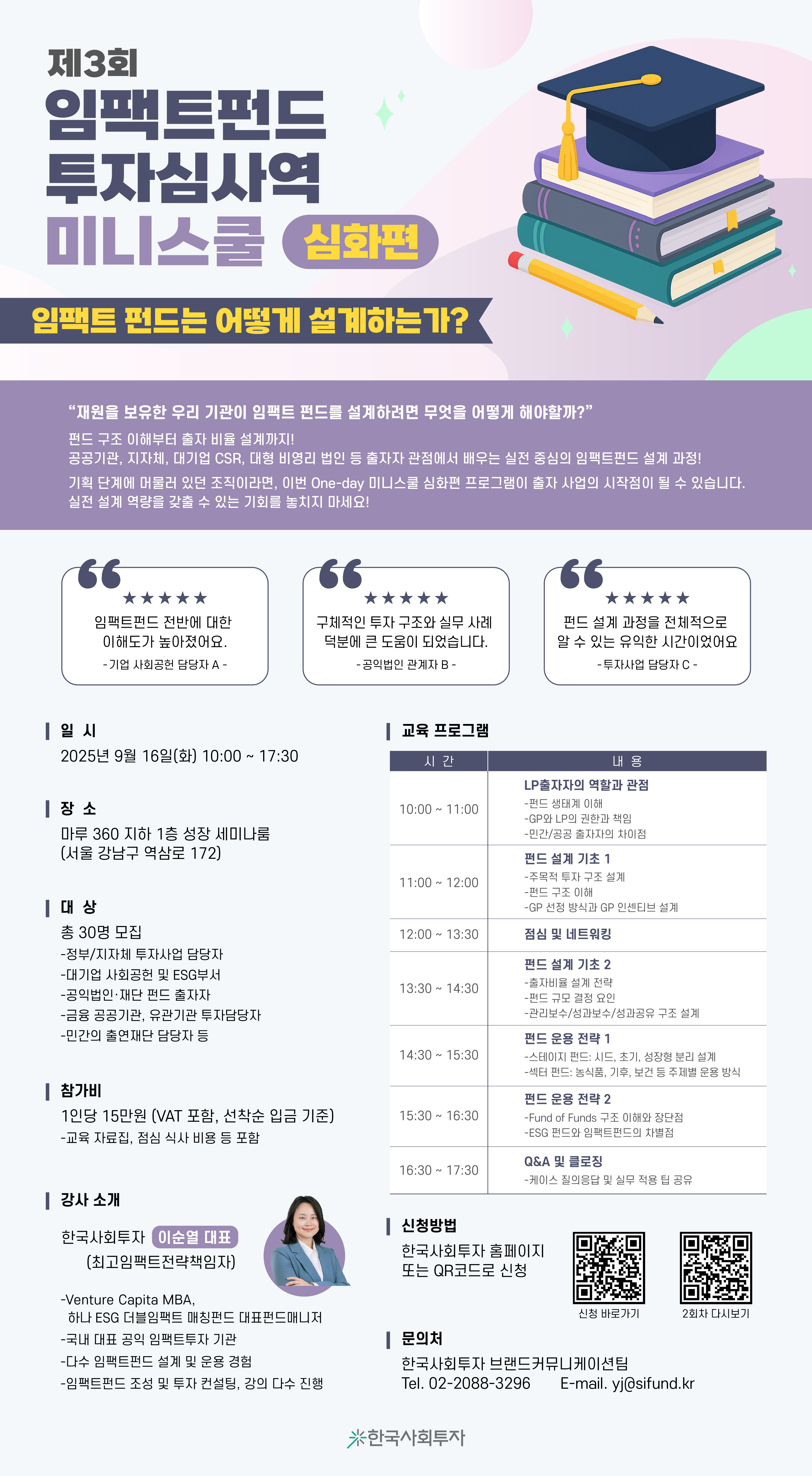 한국사회투자가 정부·지자체 투자사업 담당자, 기업 사회공헌·ESG 담당자, 공익법인 및 재단 펀드 출자자 등을 대상으로 임팩트펀드 설계와 운용을 실전 중심으로 배우는 '제3회 임팩트펀드 투자심사역 미니스쿨 심화편'을 진행합니다.