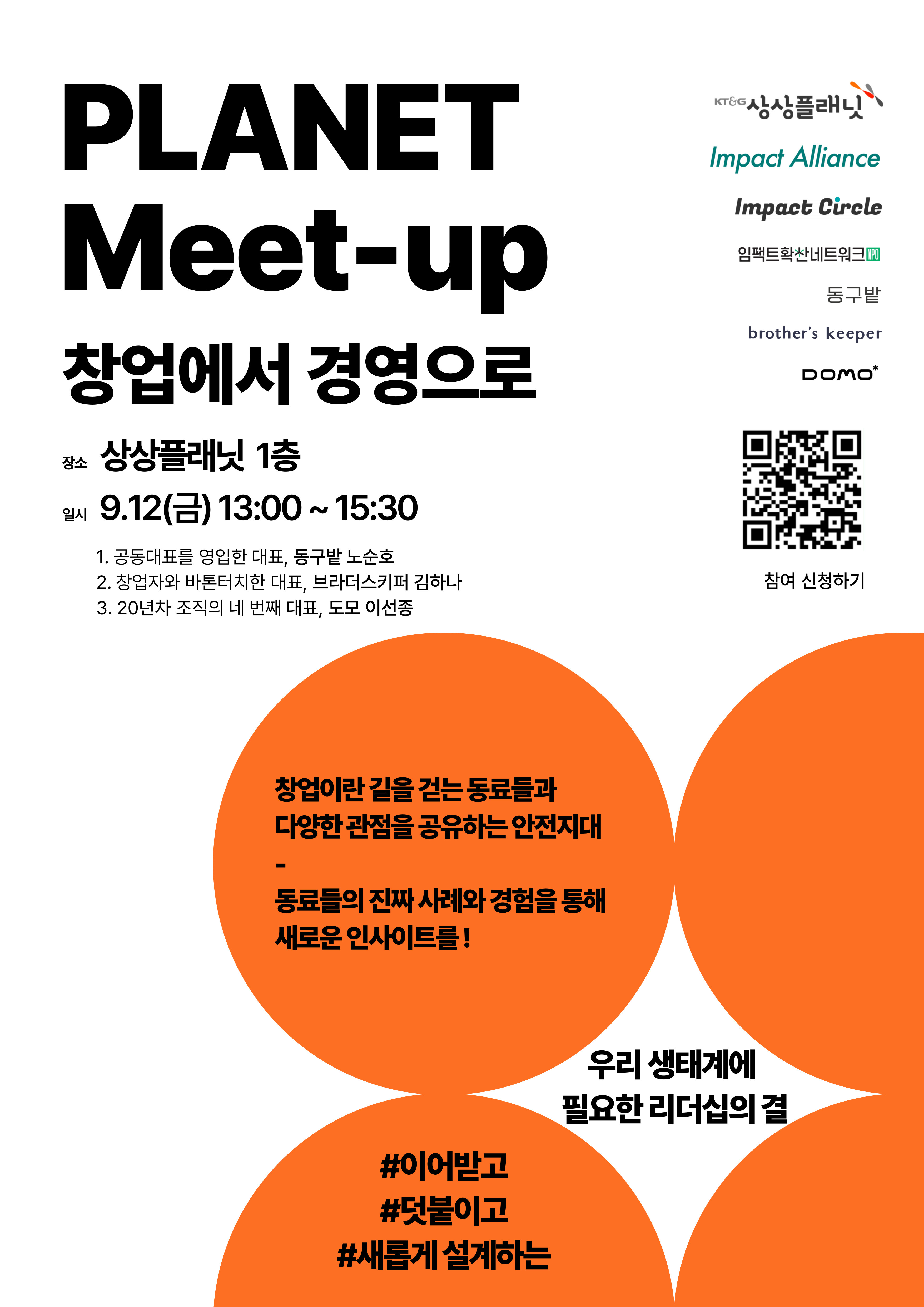 플래닛 밋업은 KT&G 상상플래닛과 임팩트얼라이언스, 임팩트서클, 임팩트확산네트워크가 함께 합니다. 플래닛 밋업에서 사회혁신 창업가를 위한 창업가의 이야기를 함께 나누며 새로운 관계를 만들어요!