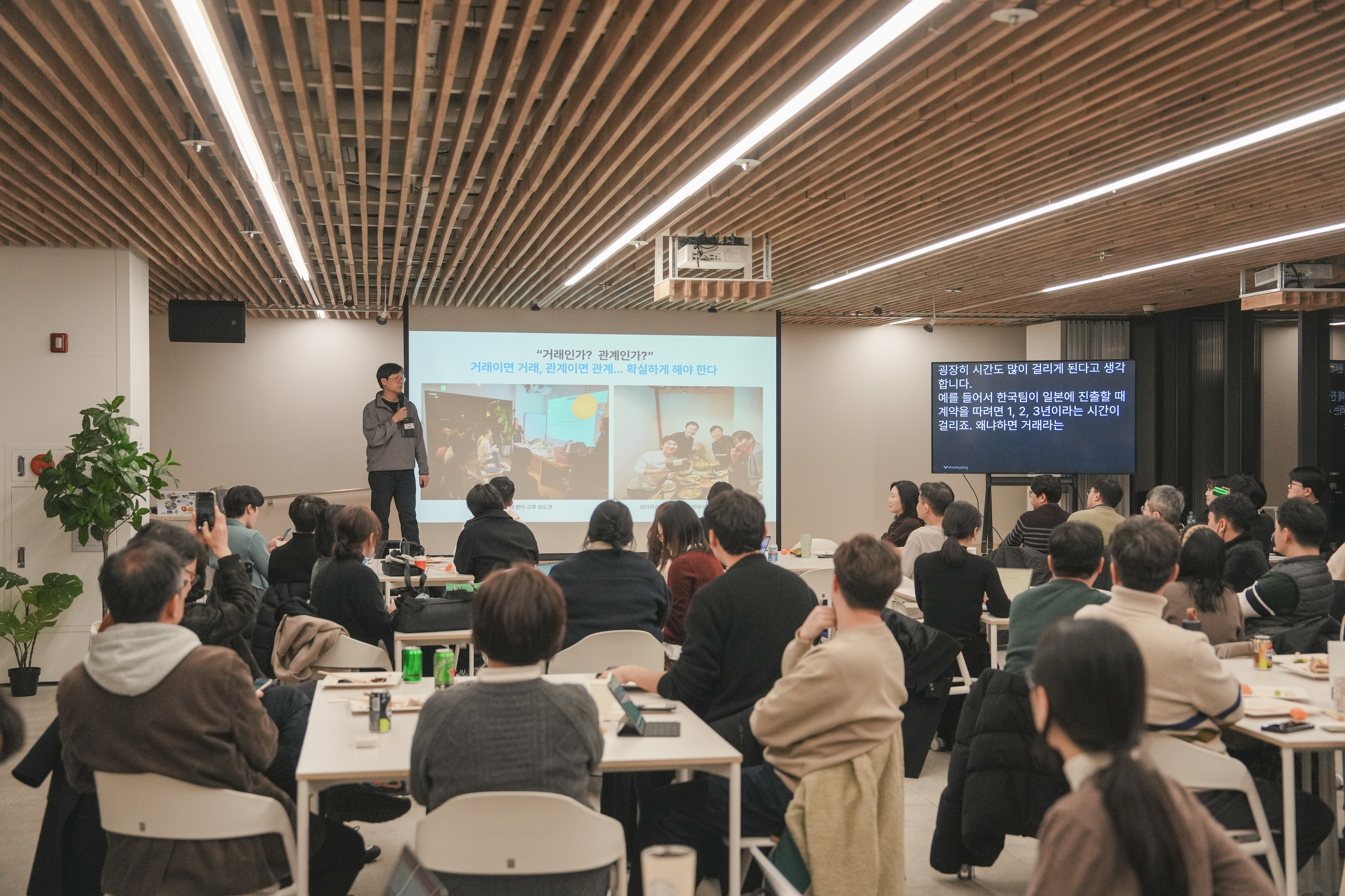 첫 번째 발제를 맡은 엠와이소셜컴퍼니 김정태 대표는 역사 전공자답게, 일본을 문화의 층위에서 먼저 읽는다. 그가 작년 한 해 일본을 여섯 번 오가며 몸으로 체득한 핵심 메시지는 단순하지만 강렬했다. "거래면 거래처럼 확실하게, 관계면 관계처럼 더 확실하게 가야 합니다. 두 가지를 섞어 가게 되면 시간이 훨씬 더 걸립니다."
