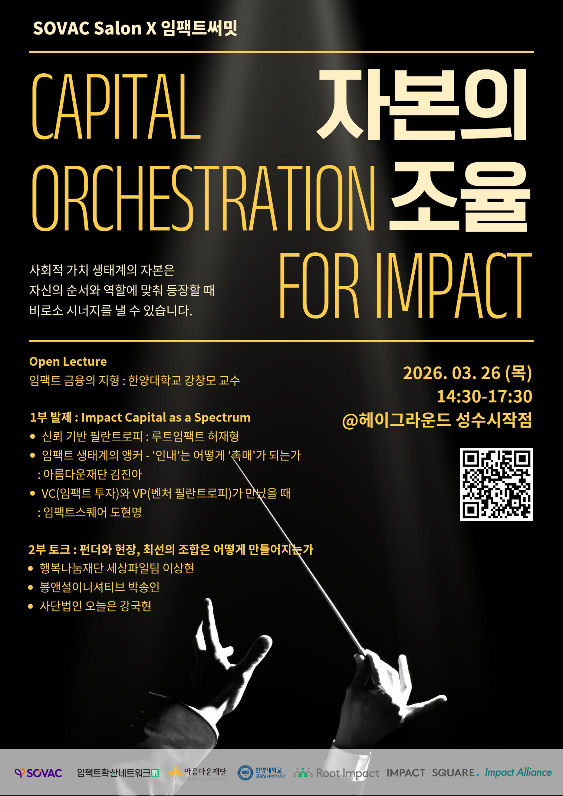 SOVAC Salon X 임팩트써밋 #임팩트금융은 '자본의 조율(Capital Orchestration for IMPACT)'를 주제로 2025년 3월 26일 목요일 헤이그라운드 브릭스 성수에서 개최되었으며, SOVAC, 임팩트확산네트워크, 아름다운재단, 루트임팩트, 임팩트스퀘어, 한양대학교 글로벌사회혁신단, 임팩트얼라이언스가 공동주관했다.