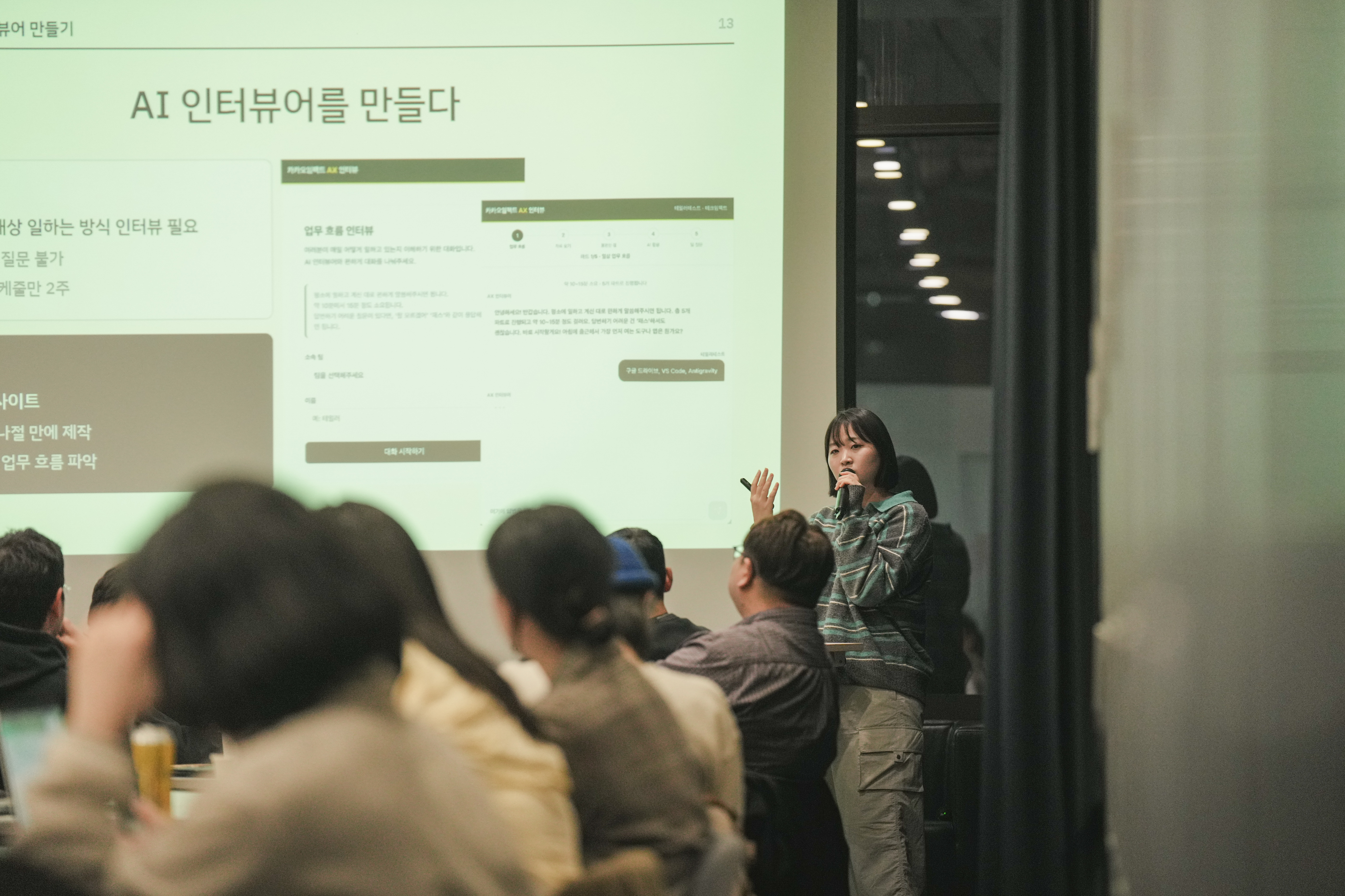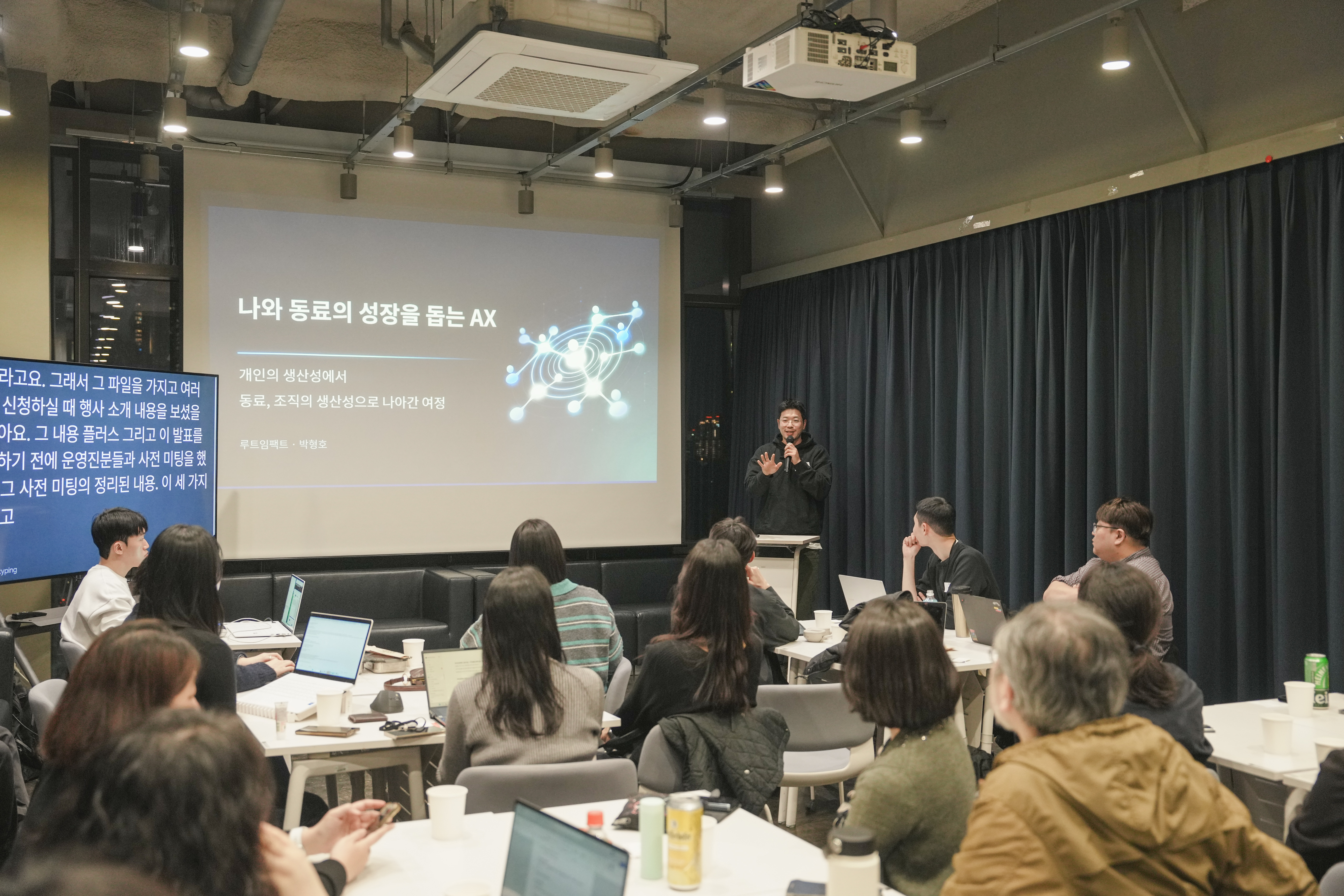 오프닝 특강을 맡은 임팩트스퀘어 김민수는 자신을 AI 전문가가 아니라고 먼저 선을 그었다. "조직이 AI를 어떻게 받아들이려고 노력하고 있는지 그 경험담을 이야기하는 건 괜찮겠다 싶어서 용기를 내서 왔다"고 했다. 뒤이어 발표할 네 사람이 레시피를 설명할 거라면, 자신은 주방을 어떻게 꾸미고 셰프의 마음가짐은 어때야 하는지를 이야기하겠다고 역할을 잡았다.