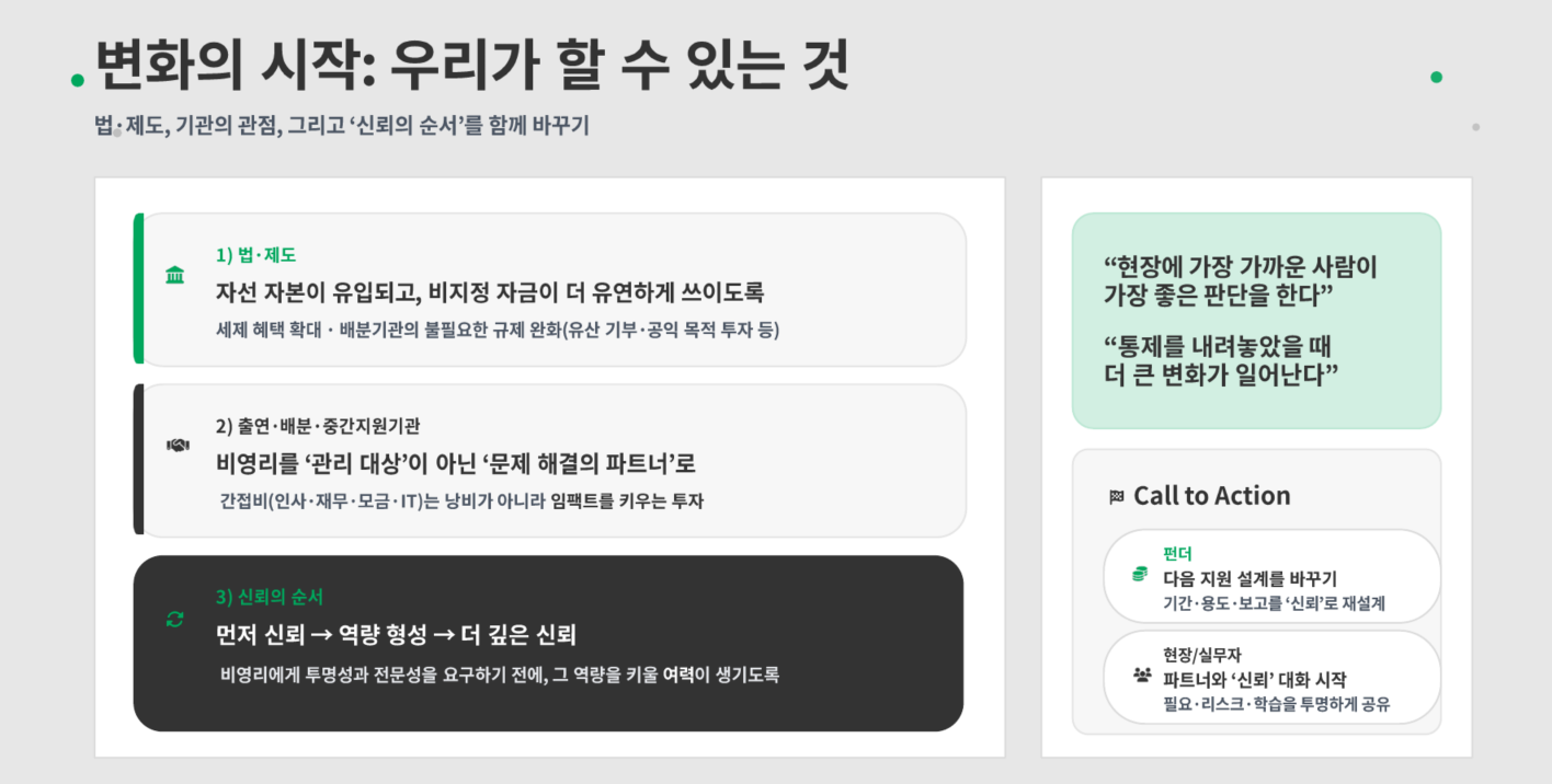 민간 자본이 흐르지 않는 또 다른 이유는 내부 거버넌스의 보수성 때문입니다. 많은 재단과 기업 이사회는 투자를 고유목적사업이 아닌 위험한 '수익사업'으로 보며 책임을 회피합니다. 이를 돌파하기 위해서는 '시간이 담보하는 신뢰'와 '제도적 변화'가 동시에 필요합니다.