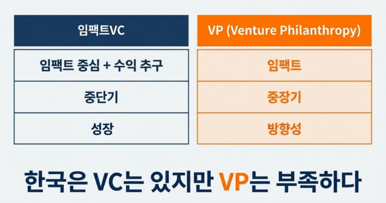 도 대표는 임팩트 VC(벤처캐피탈)와 VP(벤처 필란트로피)의 차이를 명확히 하며, '촉매적 자본'의 필요성을 역설했는데요. VC가 임팩트를 중심으로 하되 성과와 수익을 추구하는 '성장'의 파트너라면, VP는 수익보다는 임팩트라는 '방향성'에 집중하며 더 긴 호흡을 견디는 자본입니다.