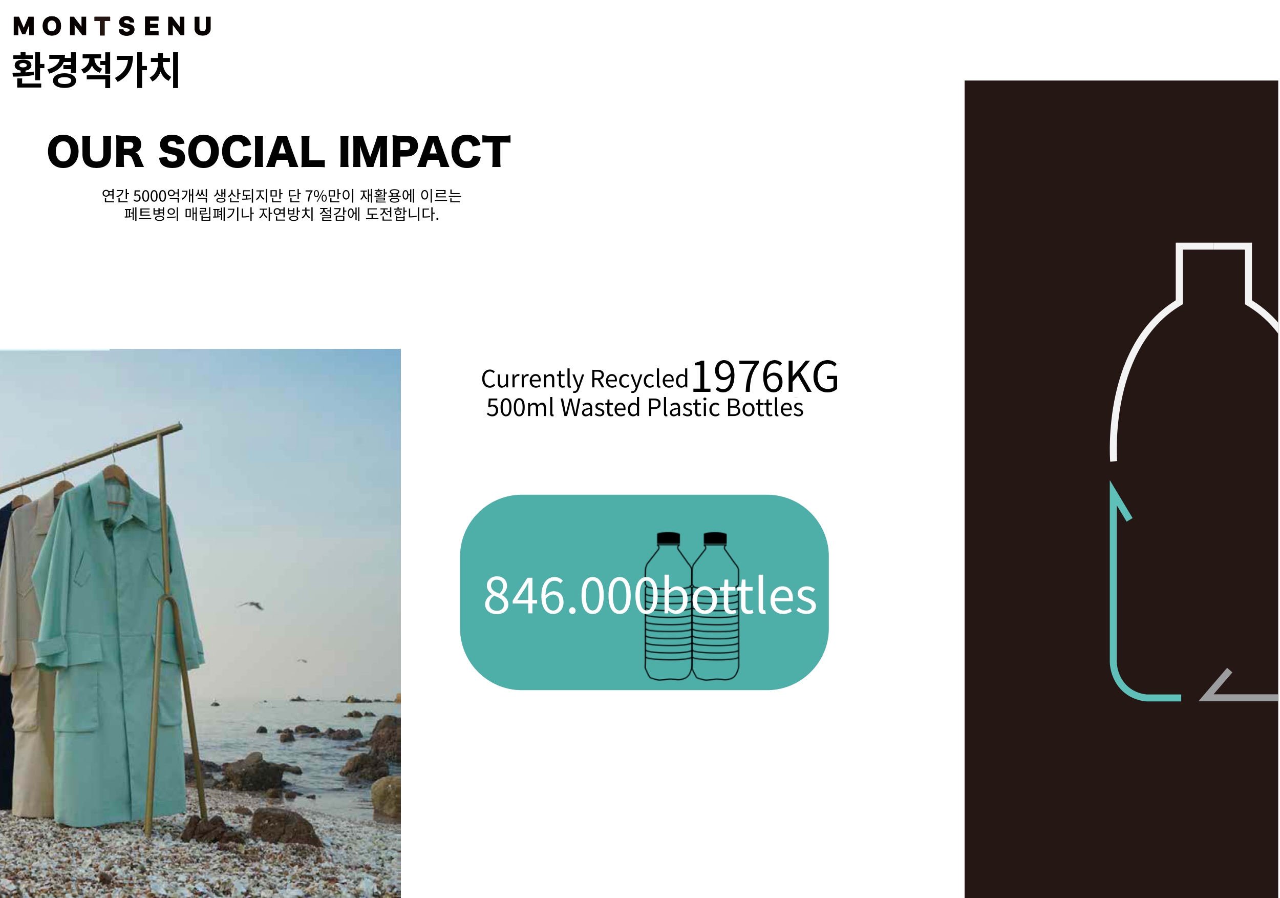 좀 더 비용을 들이거나 추가적인 가공이 필요하더라도 더 높은 수준의 제품을 만들 수 있다면 이것이야말로 진정한 '업사이클링(UP-cycling)'의 실현이라는 박준범 대표님의 말처럼 몽세누의 옷들은 버려진 페트병으로 만들어진 제품이라는 생각이 들지 않을 정도로 세련되고 우아한 멋을 뽐냅니다.