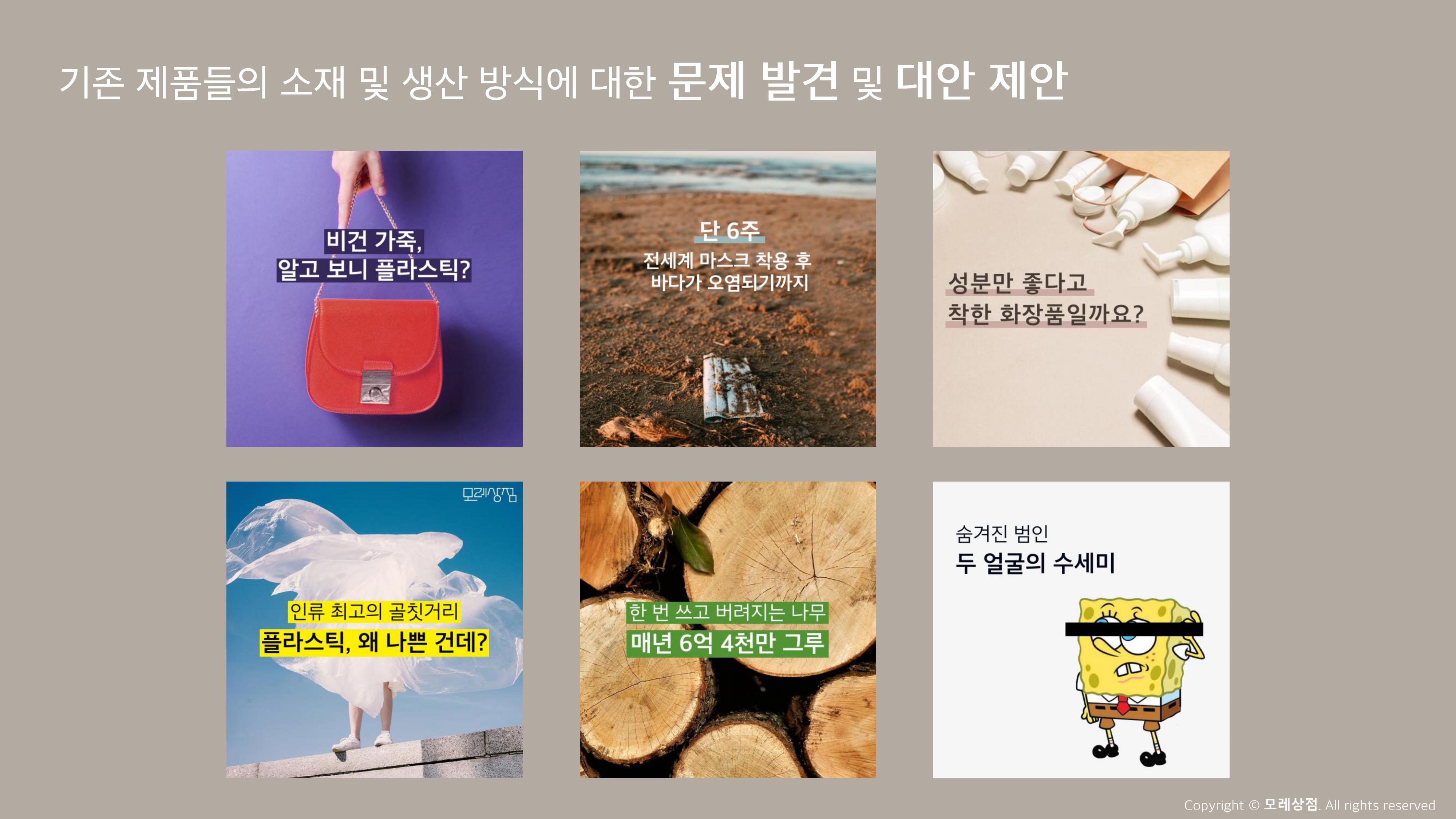 고체 샴푸, 천연수세미, 대나무 칫솔 등 시중에 친환경 제품들이 조금씩 알려지고는 있지만 소비자들이 이런 제품에 대해 일일이 찾아보고 구매하기란 여전히 쉽지 않습니다. 모레상점은 소비자들이 지속 가능하고 책임 있는 소비에 쉽게 다가갈 수 있도록 기존의 소비에서 간과되었던 문제점들을 대신 짚어주고, 이를 보완할 수 있는 대안 제품들을 모아 소개하는 온라인 플랫폼입니다.