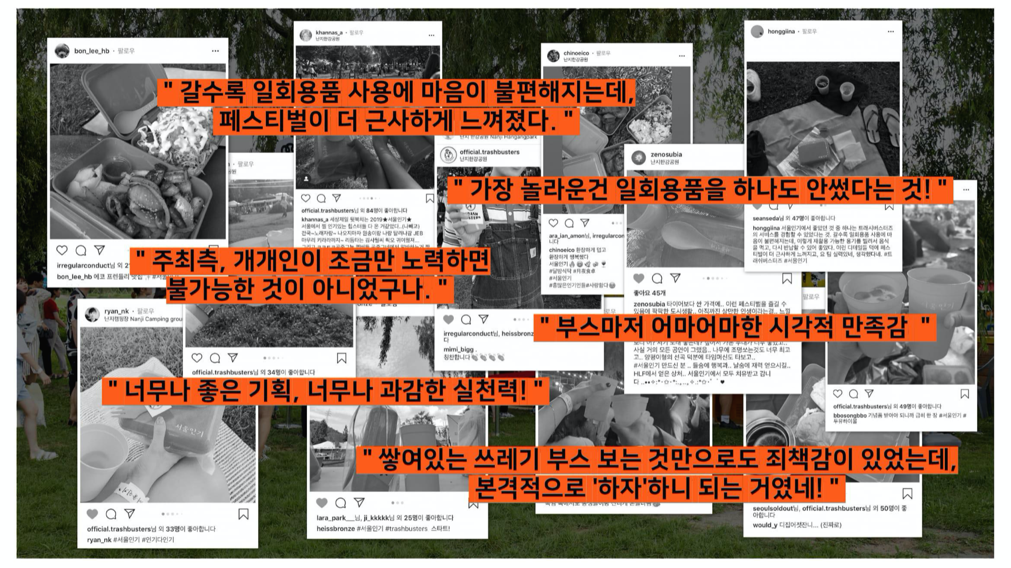 행사장에서 깨끗한 용기를 사용할 수 있으면서도 세척과 수거의 부담을 트래쉬버스터즈가 대신 감당함으로써 첫 행사부터 쓰레기 배출량을 98%까지 감축하는 결과를 만들었습니다. 관객들도 트래쉬버스터즈와 함께한 환경 보호 동참에 열광했고요!