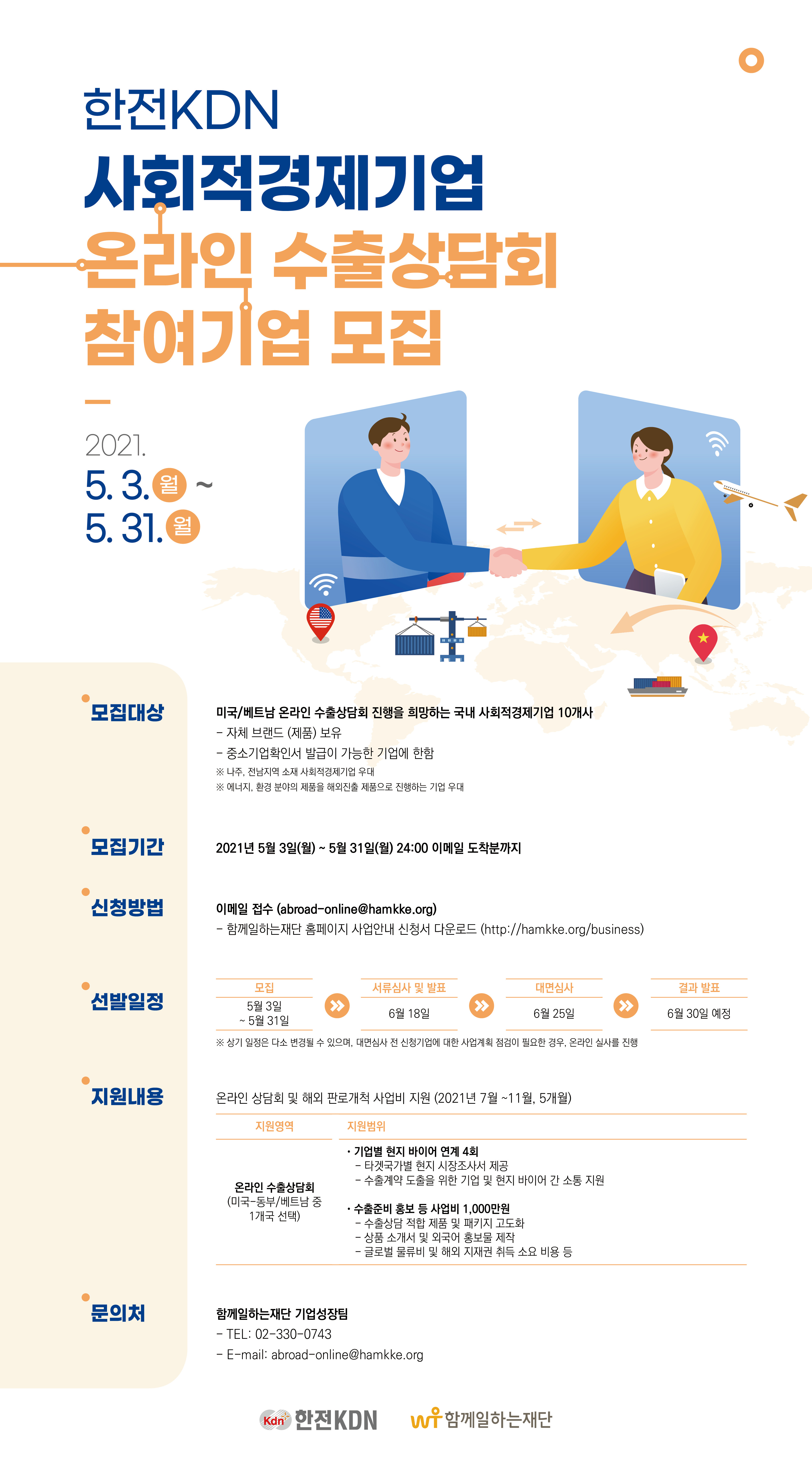 한전KDN(주)와 (재)함께일하는재단은 국내 사회적경제기업이 코로나 19 시대의 어려움을 극복하고 해외판로를 개척하여 글로벌 경쟁력을 강화할 수 있도록 "온라인 수출상담회 지원사업"에 참여할 기업을 모집하고 있습니다.