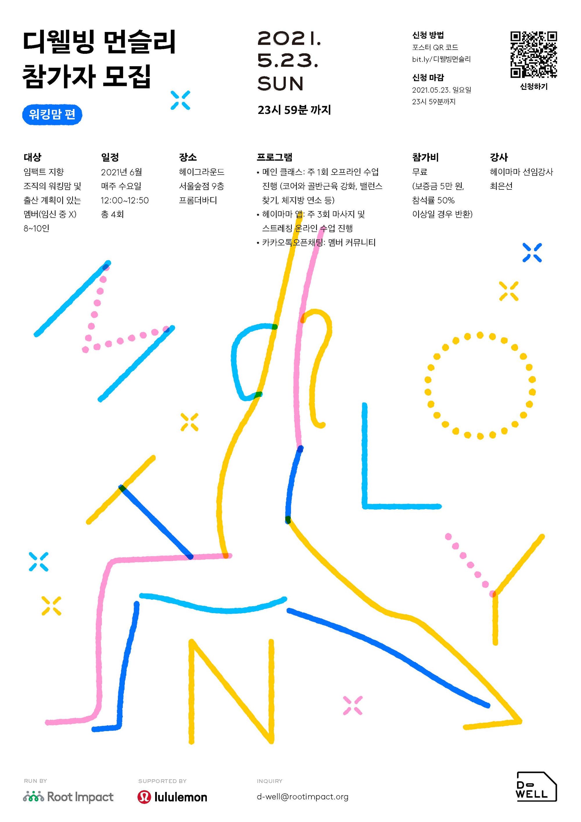 일과 육아, 가정까지 챙기느라 체력도 시간도 부족한 엄마들을 위해 디웰빙 프로젝트에서 먼슬리 워킹맘 편을 준비했어요. 6월 한 달 간 매주 수요일 점심시간에 모여 50분간 운동하며 그동안 돌아보지 못했던 몸을 하나하나 살펴보는 시간을 가져보아요. 본 프로그램은 엄마들이 건강하고 행복하게 일할 수 있는 환경을 꿈꾸는 루트임팩트, 더패밀리랩, 룰루레몬이 함께합니다.